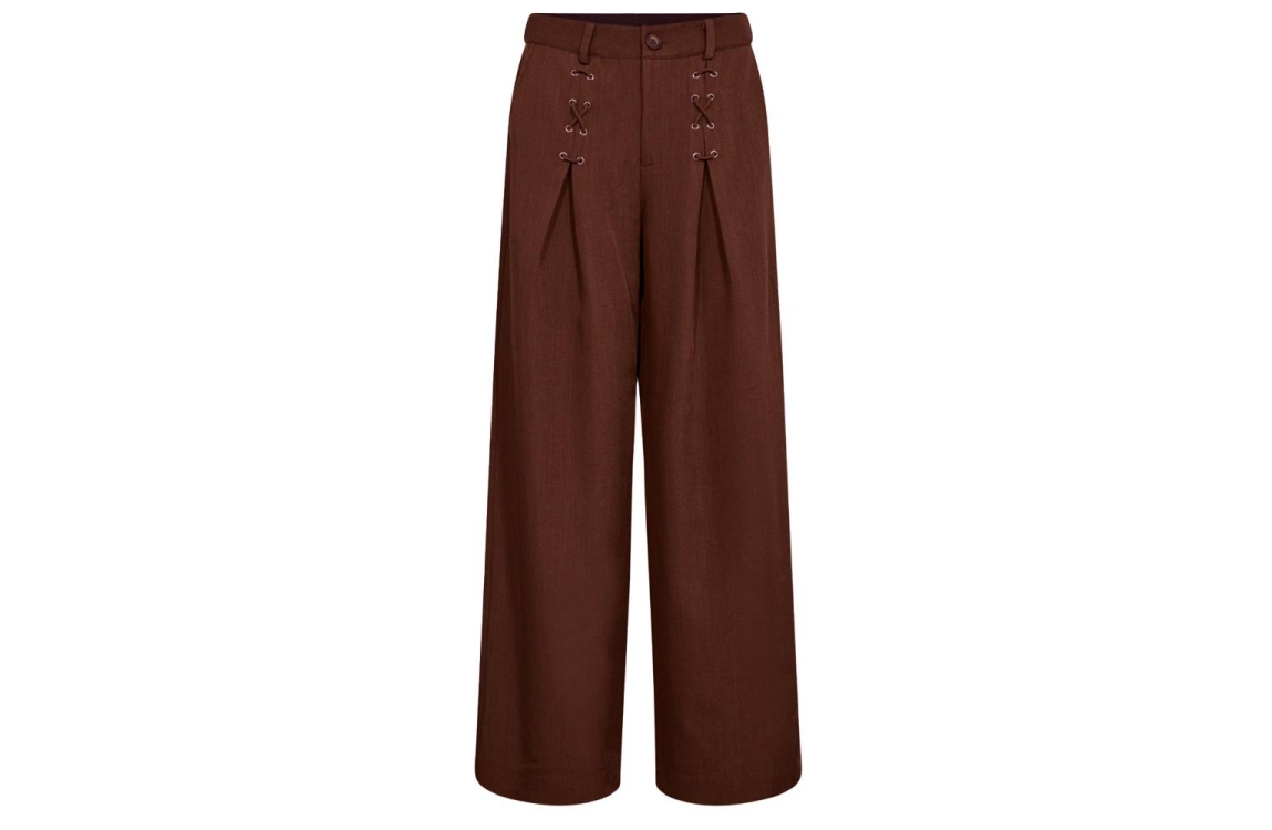 Co Couture broek Luna 31554. Dit wide leg model sluit door middel van een knoop- en ritssluiting en is voorzien van ceintuurlussen. Deze burgundy broek van Co Couture beschikt over twee steekzakken aan de voorzijde en twee paspelzakken aan de achterzijde. Het model is afgewerkt met veters- en plooidetails op de taille.
