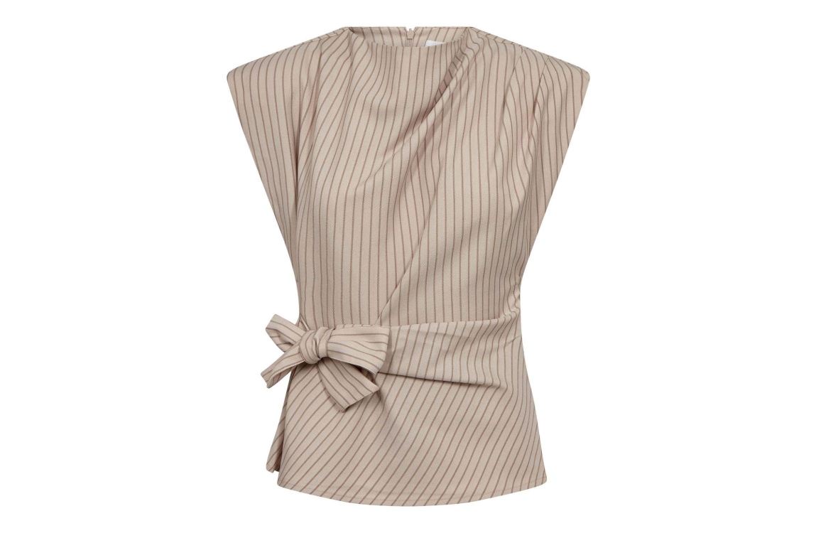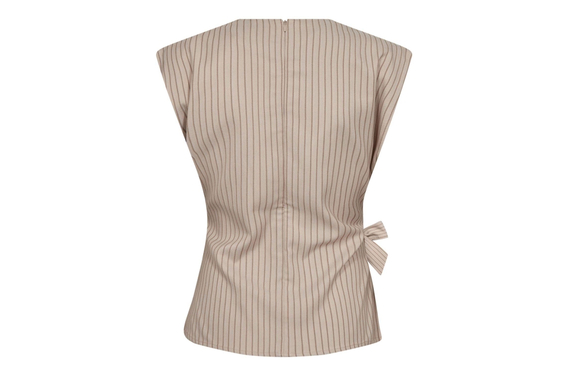 Co Couture SalvieCC Pleat Top Bone. Dit aangesloten model heeft een ronde hals en is mouwloos. Deze beige top van Co Couture sluit aan de achterzijde door middel van een rits en heeft aan de voorzijde een strikdetail. Dit model is bewerkt met een streeppatroon en heeft een bijpassende broek.