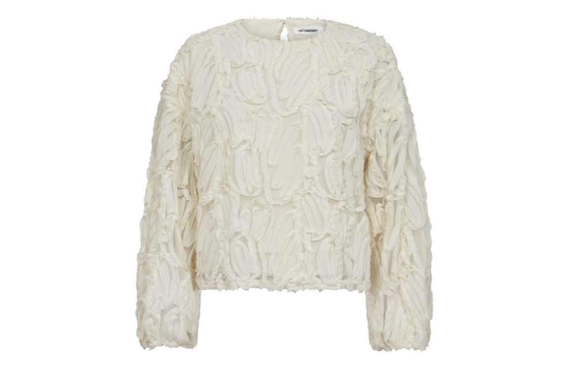 Co Couture blouse 35889. Dit rechtvallend model is voorzien van een ronde hals en heeft lange mouwen. Deze gebroken witte blouse van Co Couture is bewerkt met een patroon afgewerkt met fluffy en is bij de romp gevoerd.