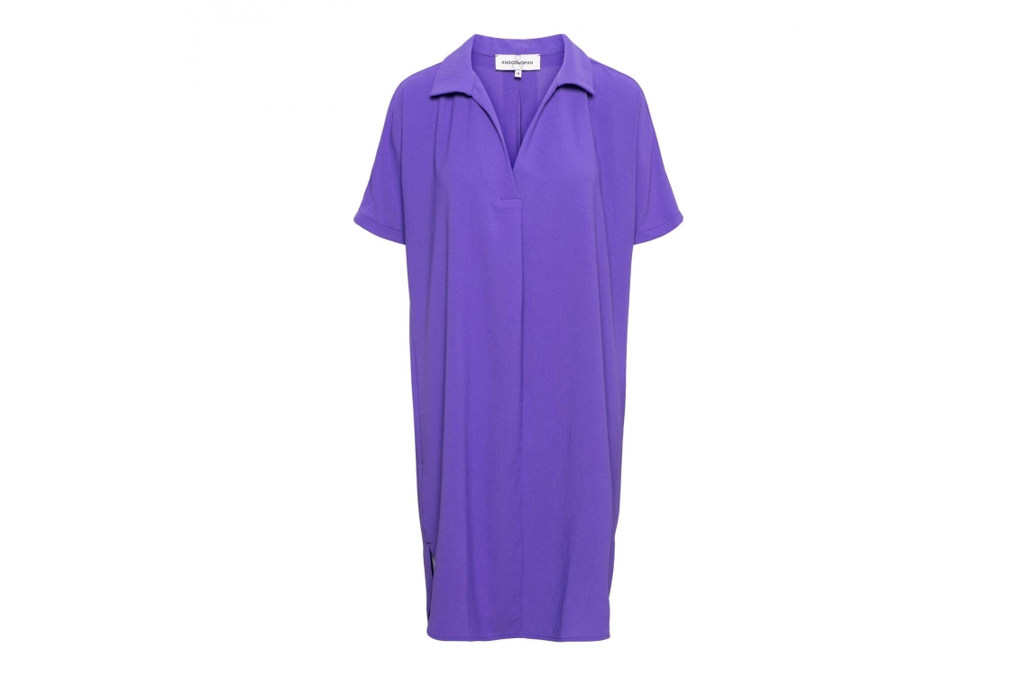 &Co Woman jurk Alison. Dit wijdvallende model is voorzien van een v-hals en kraag en heeft korte mouwen. Deze kobalt blauwe jurk van &Co Woman is voorzien van een kleine vleermuismouw en loopt rond aan de onderzijde.