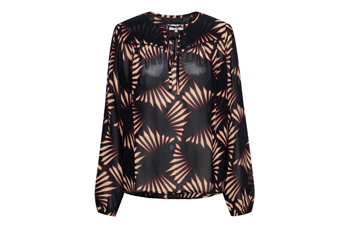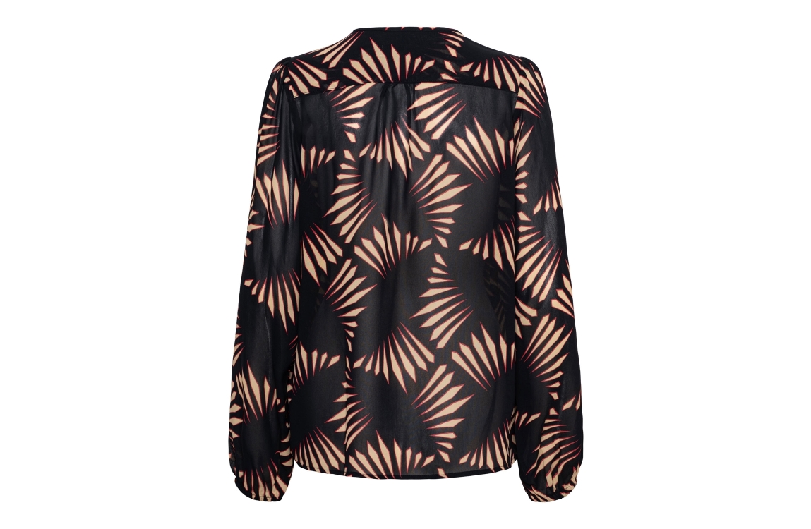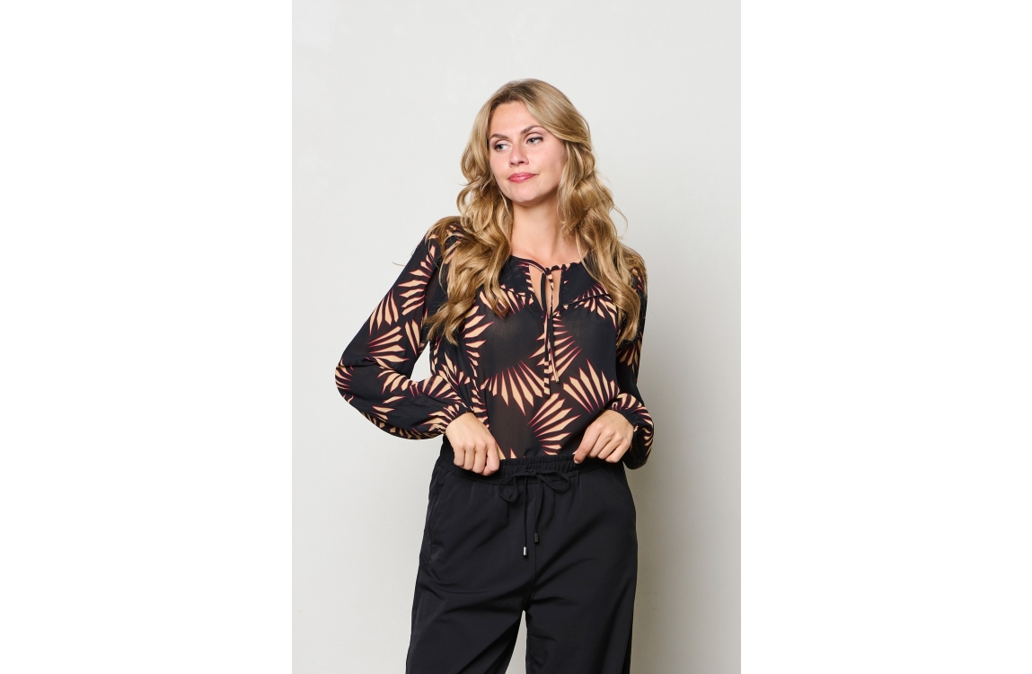 &Co Woman blouse Aurelie Graphic BL398. Dit rechtvallend model is voorzien van een ronde hals met v-inkeping dat sluit door middel van een strik en heeft lange mouwen. Deze zwarte semi transparante blouse van &Co Woman is all-over bewerkt met een grafische print in de kleuren rood en beige.
