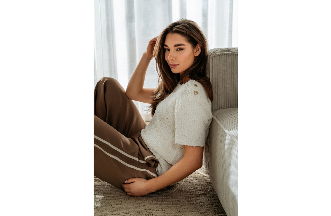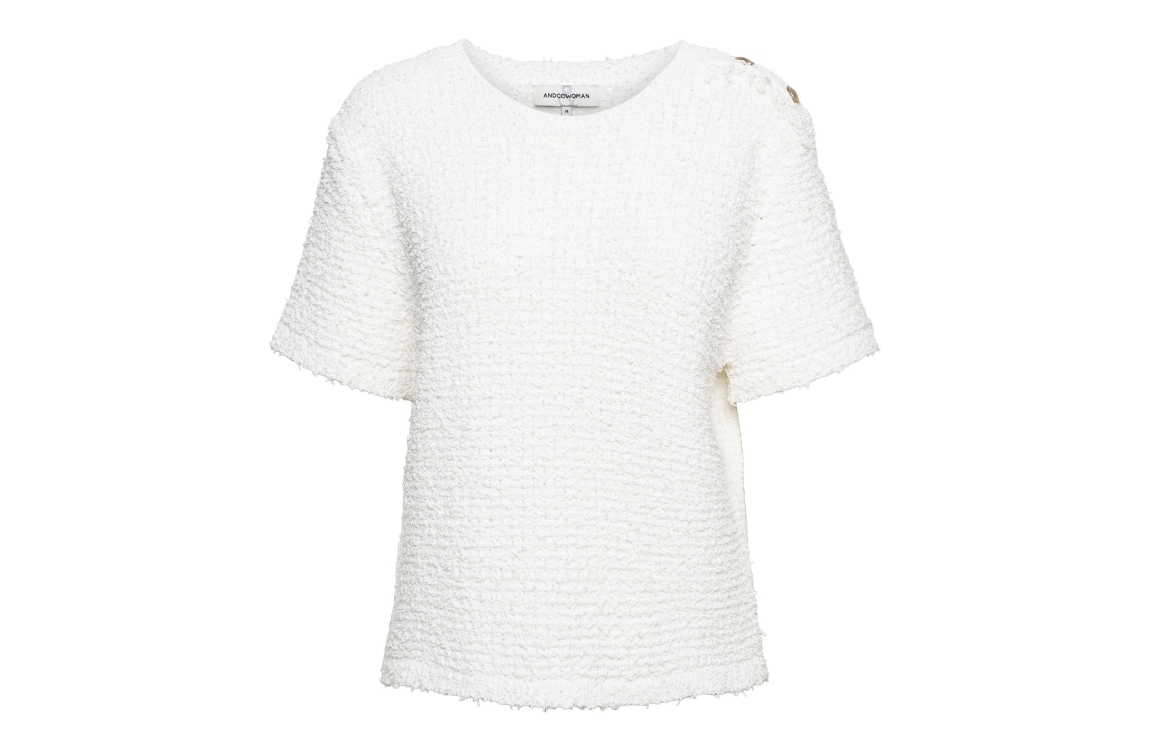 &Co Woman pullover Bianca PU144. Dit rechtvallend model is voorzien van een ronde hals met en heeft korte mouwen. Deze witte pullover van &Co Woman is bewerkt met decoratieve knopen op de schouder en is all-over gestructeerd uitgevoerd in een bouclé kwaliteit.