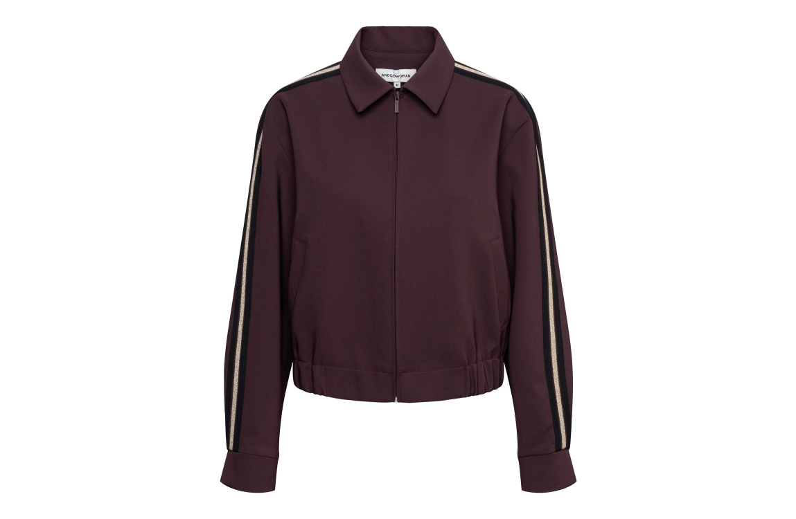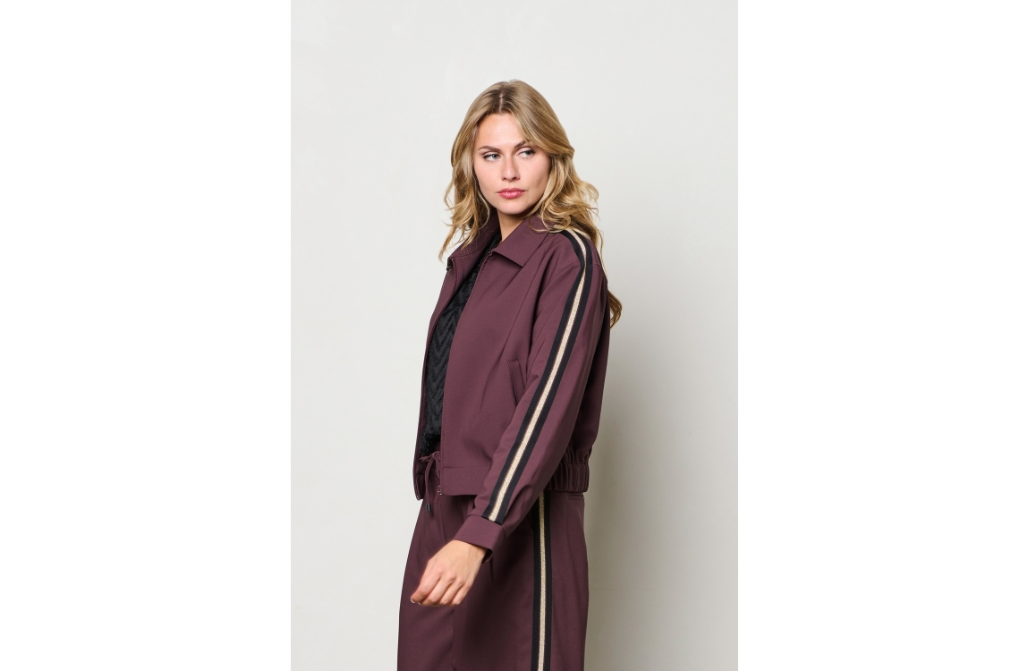 Co Woman FAITH 56081 la-aubergine. Dit sportieve model is voorzien van een kraag en heeft lange mouwen. Dit bordeaux rode jasje van &Co Woman sluit door middel van een rits. Dit model is bewerkt met een zwart/gouden tape op de mouw.