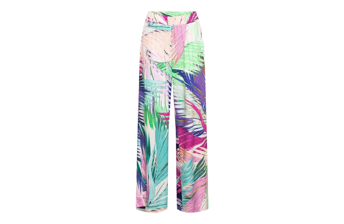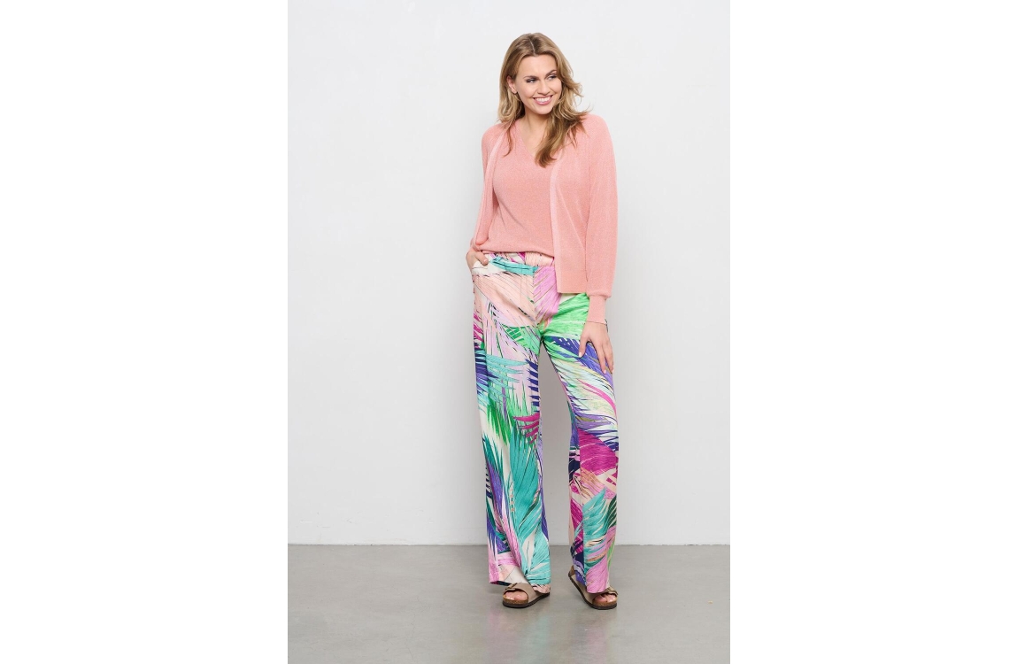 &Co Woman broek Julie pa315. Dit rechtvallende model sluit aan de bovenzijde door middel van een elastische boord en beschikt over twee steekzakken aan de voorzijde. Deze multi colour broek van &Co Woman is bewerkt met een bladprint.