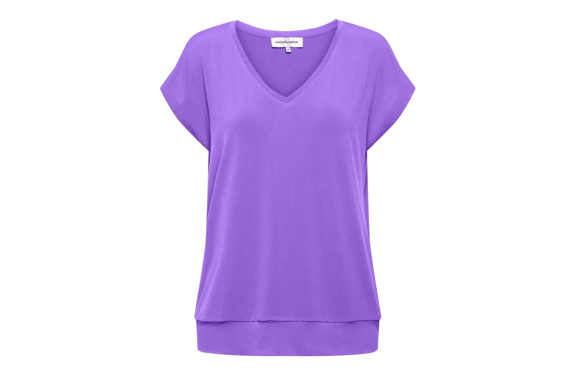 &Co Woman shirt Lucia TO190. Dit soepelvallende model heeft een v-hals, korte mouwen en heeft een elastische boord aan de onderzijde. Dit paarse shirt van &Co Woman is uitgevoerd in een comfortabel materiaal.