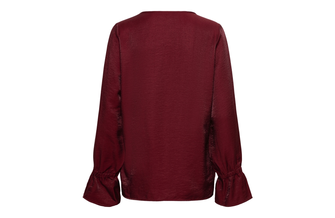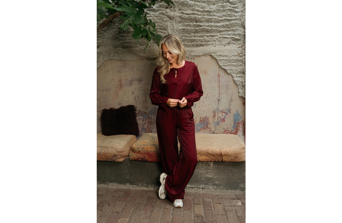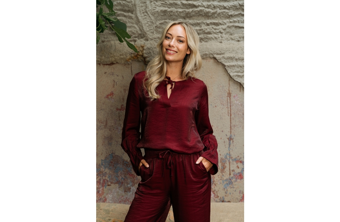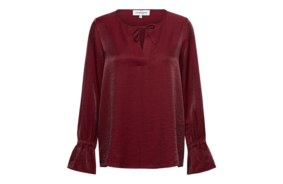 &Co Woman blouse Melina BL406. Dit rechtvallend model is voorzien van een ronde hals met v-inkeping dat sluit door middel van een strik en heeft lange mouwen met ruches aan de uiteinden. Deze rode blouse van &Co Woman is uitgevoerd in een glanzende kwaliteit.