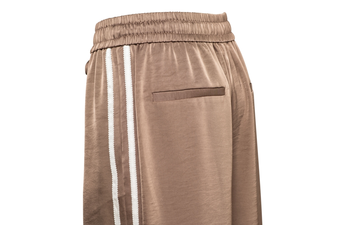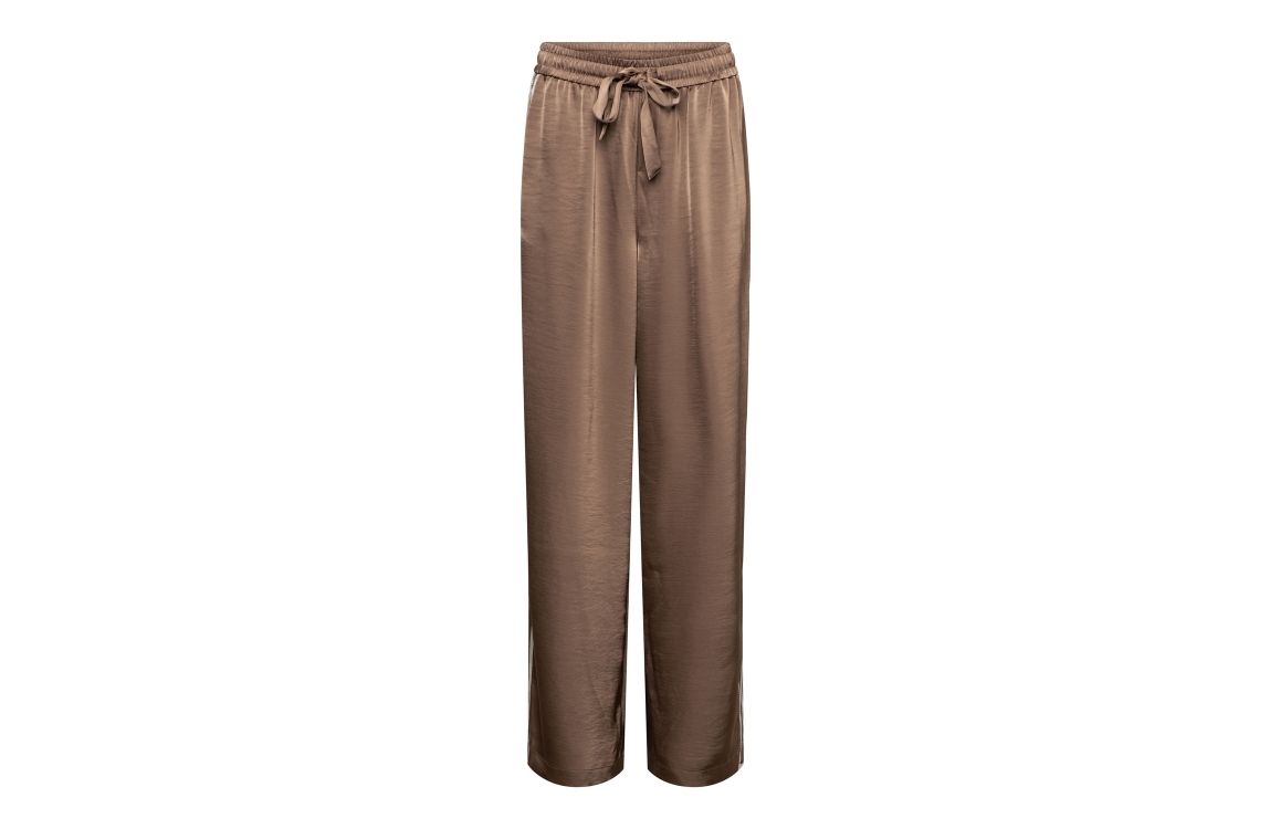 &Co Woman broek Neomi PA407. Dit wide leg model sluit door middel van een elastische boord met trekkoorden. Deze bruine satijnen look broek van &Co Woman beschikt over steekzakken aan de voor- en achterzijde. Dit model is bewerkt met witte strepen aan de zijkanten.