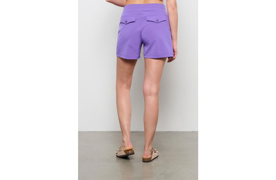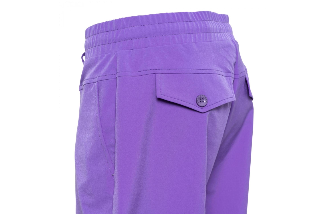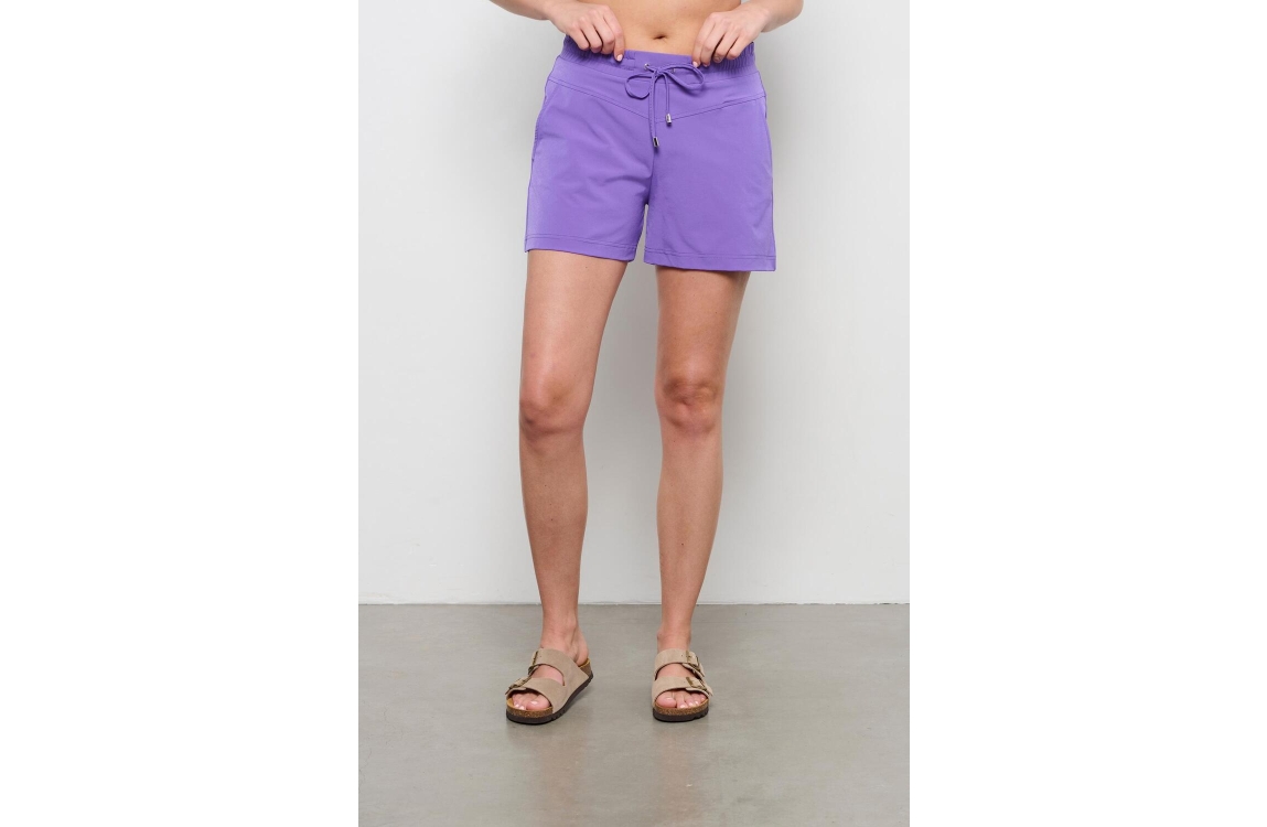&Co Woman short Penny. Dit rechtvallende model heeft een elastische band voorzien van een strikkoord en heeft korte pijpen. Deze paarse kortebroek van &Co Woman is afgewerkt met twee schuine steekzakken aan de voorzijde en twee klepzakken aan de achterzijde. Dit model is uitgevoerd in de welbekende travel kwaliteit.