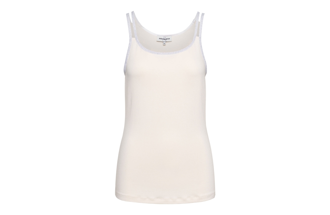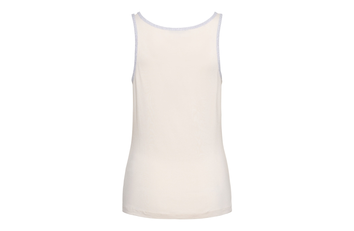 &Co Woman top Selly SG112. Dit aangesloten beige model is voorzien van een ronde hals en heeft spaghettibandjes beide bewerkt met een zilverkleurige glitter.
