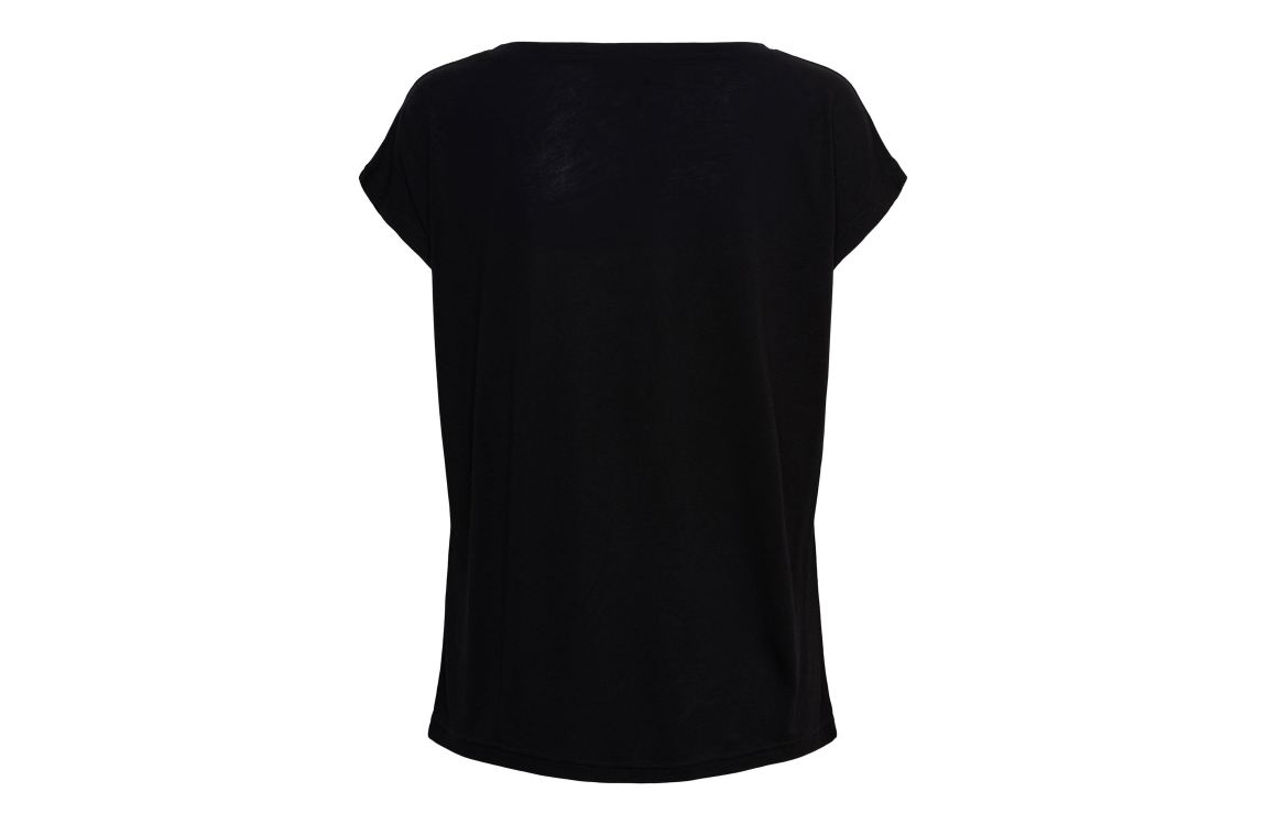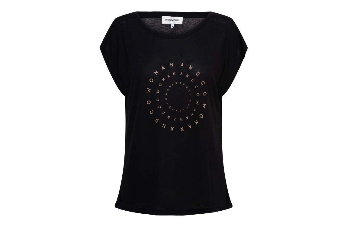 Co Woman SIGNY 56050 a-black. Dit rechtvallende model heeft een ronde hals en korte mouwen. Dit zwarte T-shirt van &Co Woman is op het voorpand bewerkt met een tekstuele opdruk en is uitgevoerd in lichte stretchkwaliteit.