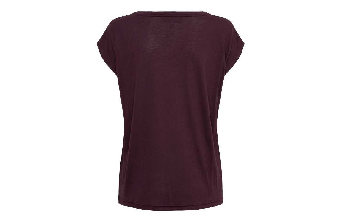 Co Woman SIGNY 56081 la-aubergine. Dit rechtvallende model heeft een ronde hals en korte mouwen. Dit bordeaux rode T-shirt van &Co Woman is op het voorpand bewerkt met een tekstuele opdruk en is uitgevoerd in lichte stretchkwaliteit.