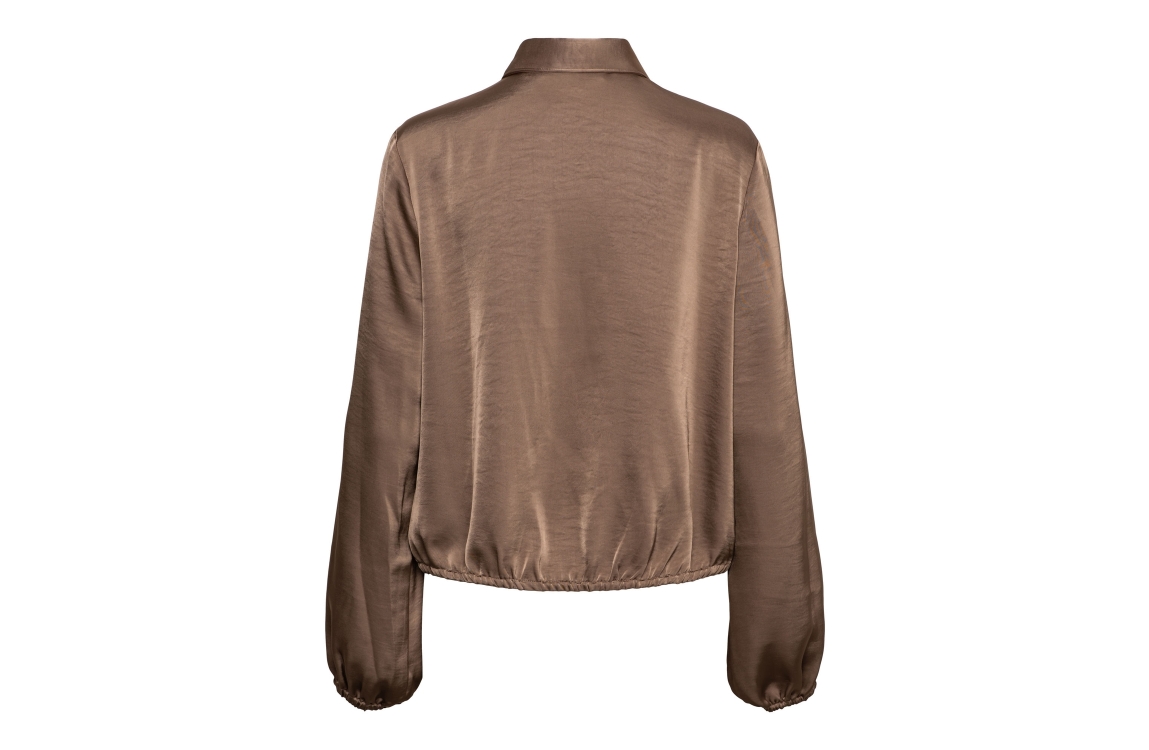 &Co Woman blouse Wendelien BL407. Dit rechtvallend model is voorzien van een kraag en heeft lange mouwen. Deze bruine satijnen look blous van &Co Woman sluit door middel van knopen en beschikt over een elastische boord aan de onderzijde.