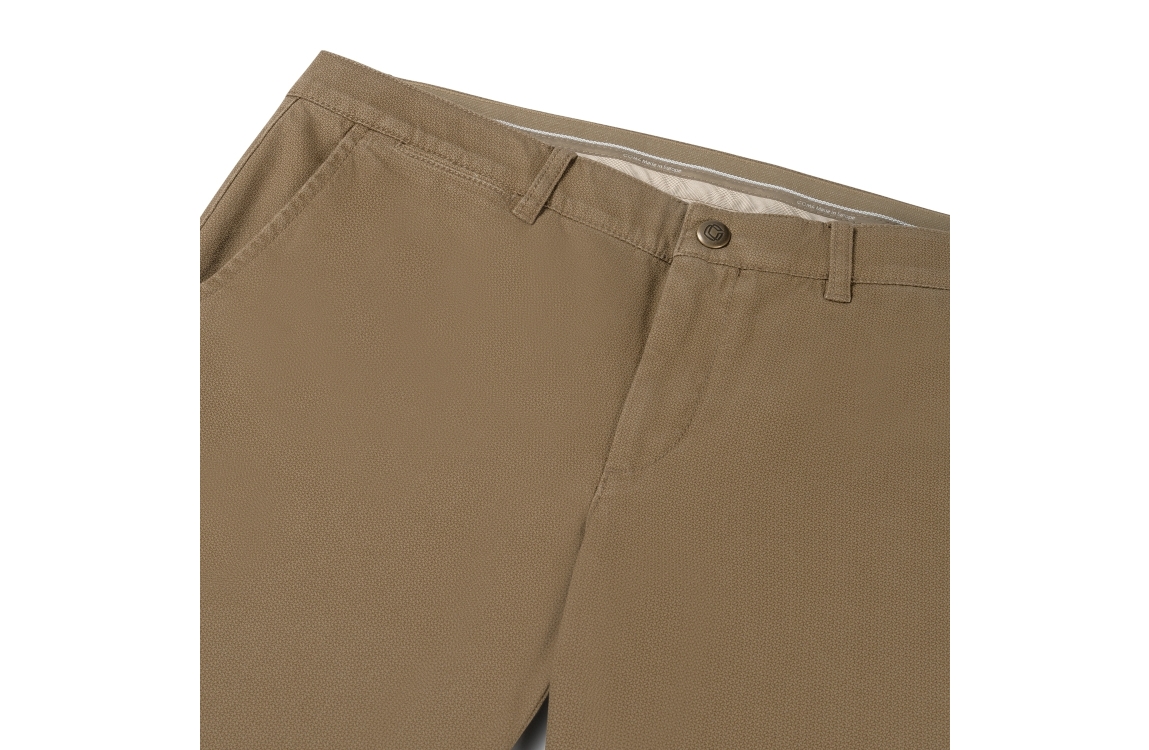 Com4 chino 21282120. Dit aangesloten model is voorzien van twee steekzakken aan de voorzijde en twee steekzakken aan de achterkant. Deze donker beige broek van Com4 heeft een all over grafsich patroontje en sluit door middel van een knoop en rits.