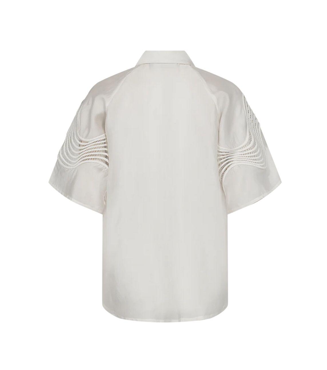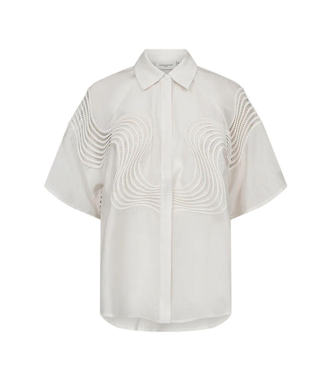 Copenhagen Muse blouse CMMOLLY 206243. Dit rechtvallend model is voorzien van een kraag en heeft korte mouwen. Deze witte blouse van Copenhagen Muse sluit door middel van knopen en is bewerkt met opengewerkte details.