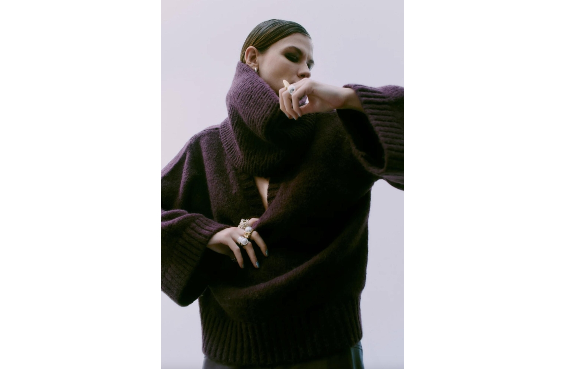 Copenhagen Muse Chamdrea trui. Dit rechtvallend model heeft een V-hals en lange mouwen. Deze gebreide paarse trui van Copenhagen heeft een afneembare brede kraag en extra brede mouwen. Dit model heeft verlaagde schouders en is afgewerkt met ribgebreide boorden.