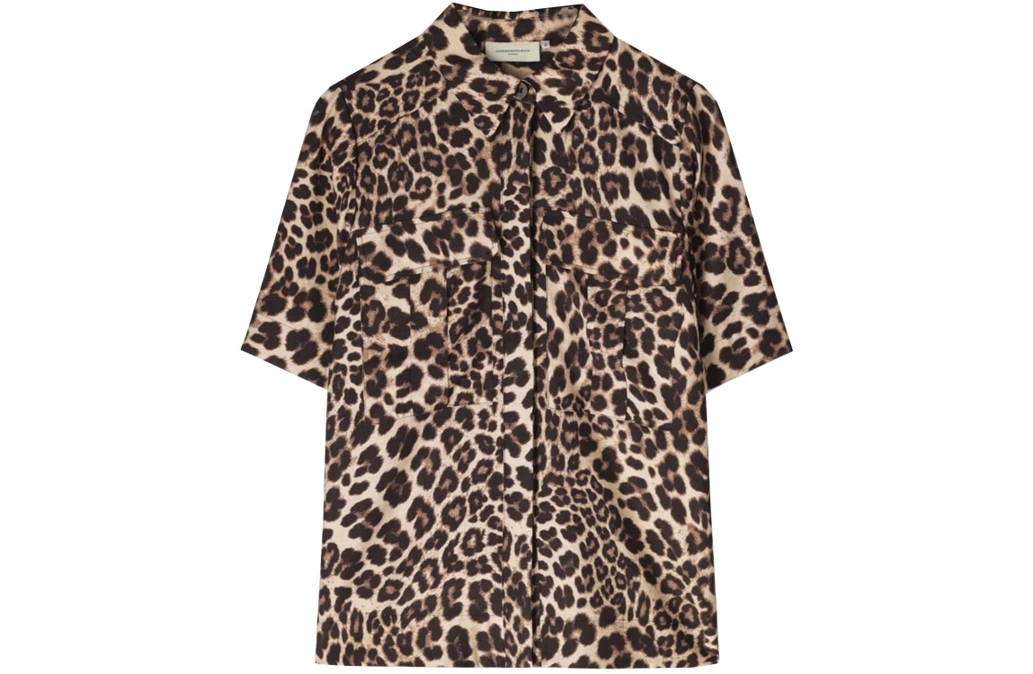 Copenhagen Muse blouse Gabby 206189. Dit rechtvallend model is voorzien van een kraag en heeft korte mouwen. Deze beige blouse met dierenprint van Copenhagen Muse sluit door middel van knopen en beschikt over twee klepzakken op de borst.