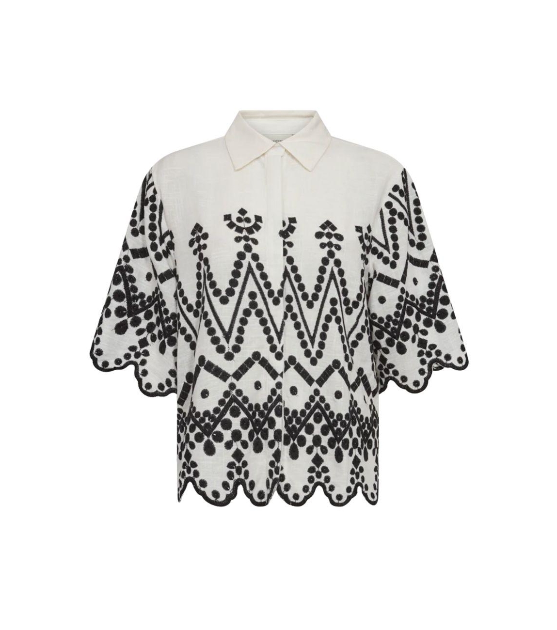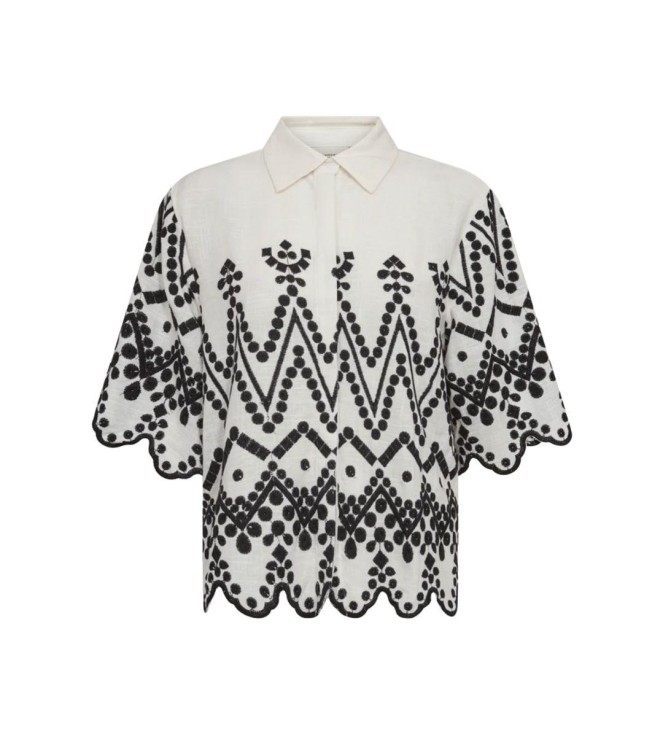 Copenhagen Muse shirt 206381. Dit rechtvallend model is voorzien van een kraag en heeft driekwart mouwen. Deze witte shirt van Copenhagen Muse sluit door middel van knopen en is gedeeltelijk bewerkt met zwarte broderie.
