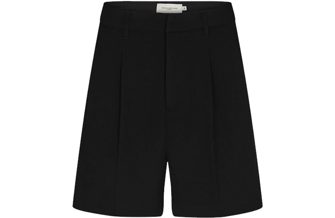 Copenhagen Muse short Tailor. Dit rechtvallend model sluit door middel van een knoop en een rits afgewerkt met ceintuurlussen. Deze zwarte short van Copenhagen Muse is voorzien van twee steekzakken aan de voorzijde en twee decoratieve paspelzakken aan de achterzijde. Dit model is bewerkt met plooidetails.