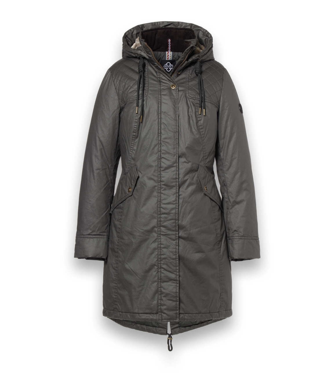 District KITZBUHL winterjas LM43630253/777. Dit rechtvallende model heeft een capuchon en lange mouwen. Deze groene winterjas van District sluit door middel van een knoop en een rits en is voorzien van verschillende jaszakken.