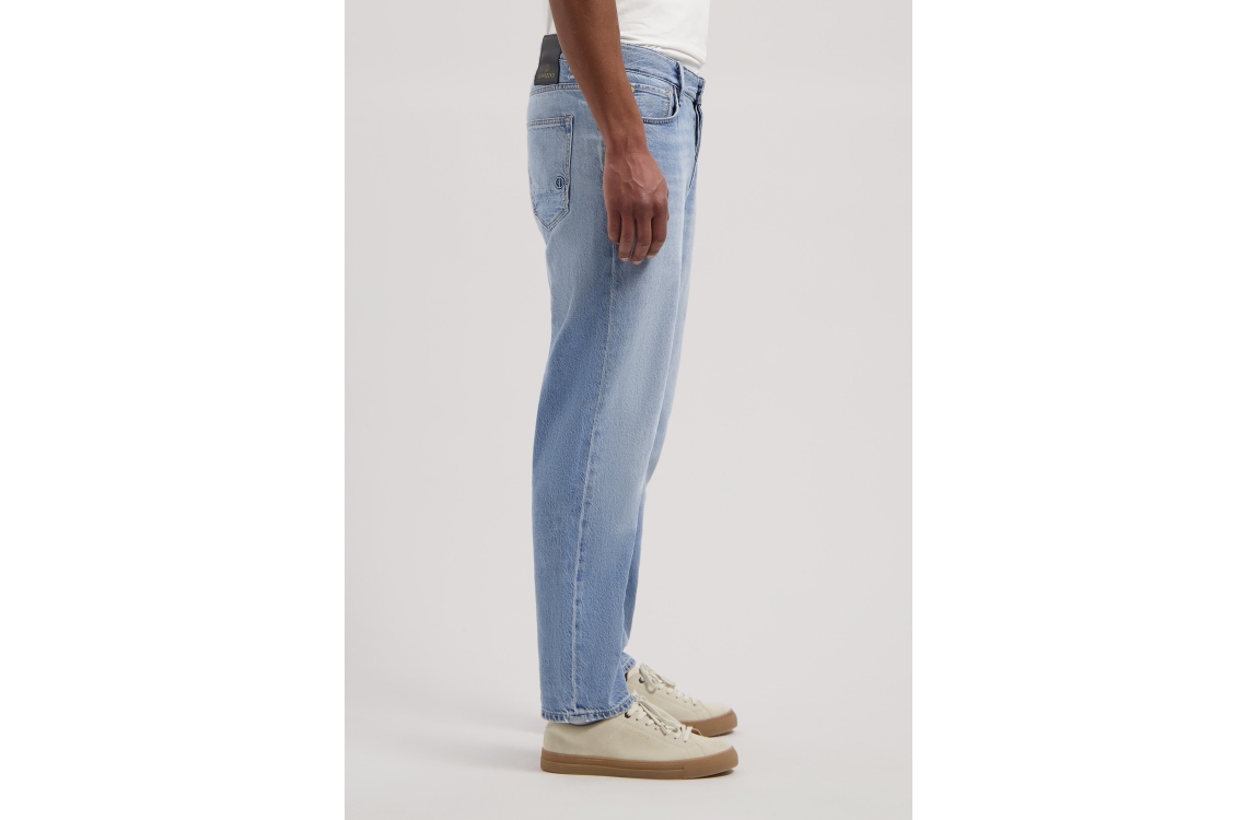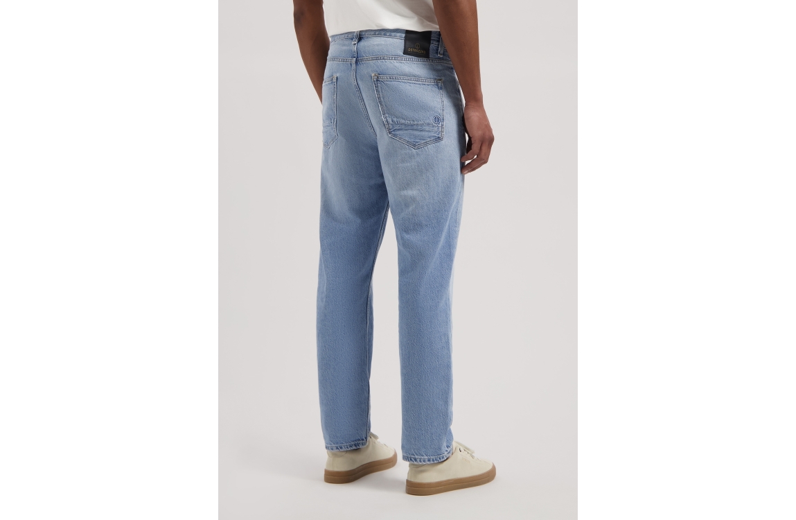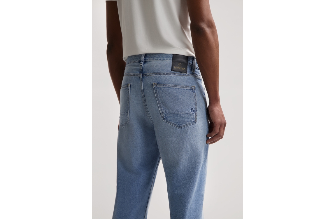Dstrezzed Logan jeans 551551. Dit wide fit model sluit door middel van een knoop en een rits. Deze blauwe denim jeans van Dstrezzed is voorzien van ceintuurlussen en verschillende broekzakken.