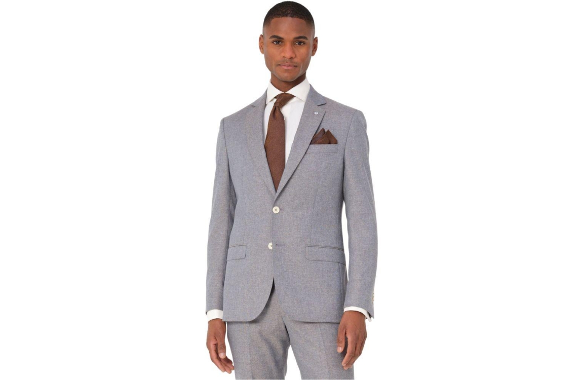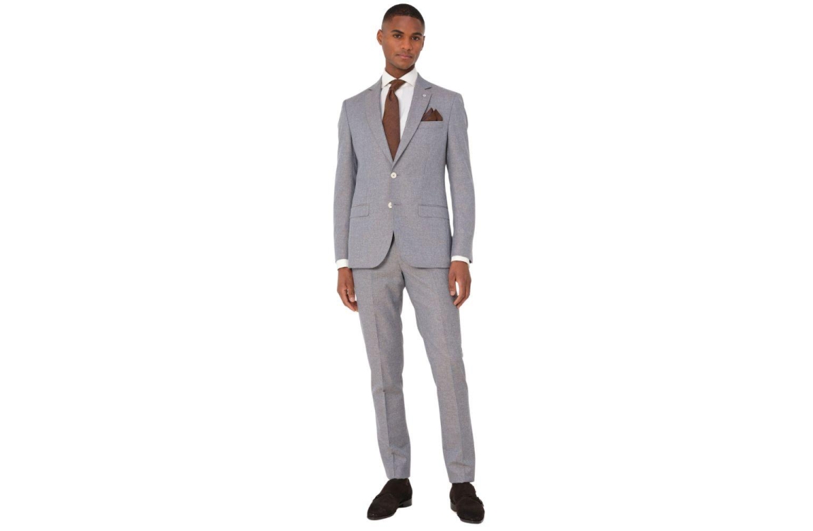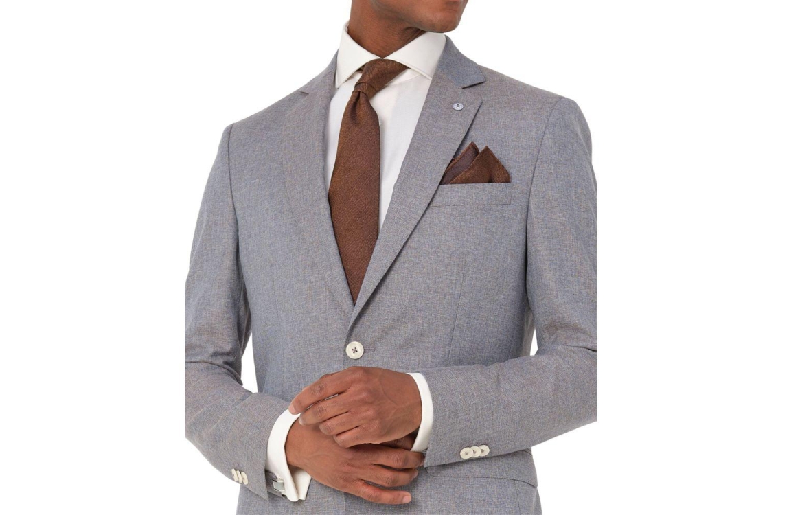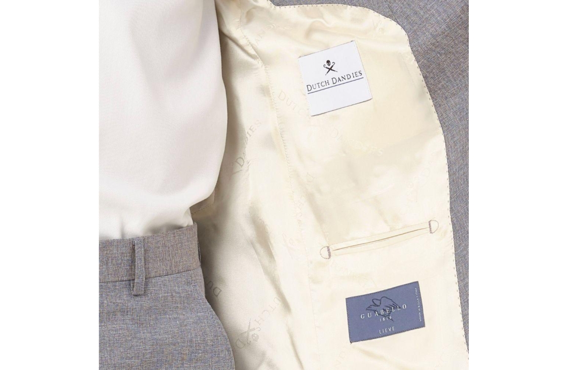 Dutch Dandies trouwpak DD249 Lilas. Dit tweedelige bruin grijze pak bestaat uit een pantalon en een blazer. Dit item is slim fit en heeft een geweven patroon. De pantalon sluit door middel van knopen, een rits en is voorzien van ceintuurlussen. Daarnaast beschikt de pantalon van Dutch Dandies over twee schuine steekzakken op het voorpand en twee paspelzakken met knoop op de achterzijde. En daarnaast beschikt deze set over een gevoerde colbert. Dit item sluit door middel van twee knopen, beschikt over een reverskraag en is onderaan de lange mouwen afgewerkt met knoopjes. Deze colbert van Dutch Dandies beschikt over twee klepzakken aan de voorzijde, een borstzak en verschillende zakken aan de binnenzijde. Dit trouwpak is uitgevoerd in een gemeleerde kwaliteit