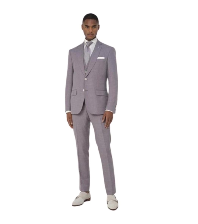 Dutch Dandies trouwpak DD345 Lilas. Dit driedelige lila pak bestaat uit een pantalon, gilet en een blazer. Dit item is slim fit en heeft een geweven patroon. De pantalon sluit door middel van knopen, een rits en is voorzien van ceintuurlussen. Daarnaast beschikt de pantalon van Dutch Dandies over twee schuine steekzakken op het voorpand en twee paspelzakken met knoop op de achterzijde. De gevoerde gilet sluit door middel van knopen, heeft een kraag en is voorzien van twee paspelzakken op het voorpand. Als laatste beschikt deze set nog over een gevoerde colbert. Dit item sluit door middel van twee knopen, beschikt over een reverskraag en is onderaan de lange mouwen afgewerkt met knoopjes. Deze colbert van Dutch Dandies beschikt over twee klepzakken aan de voorzijde, een borstzak en verschillende zakken aan de binnenzijde. Dit trouwpak is uitgevoerd in een gemeleerde kwaliteit