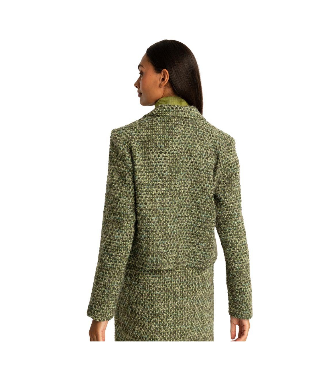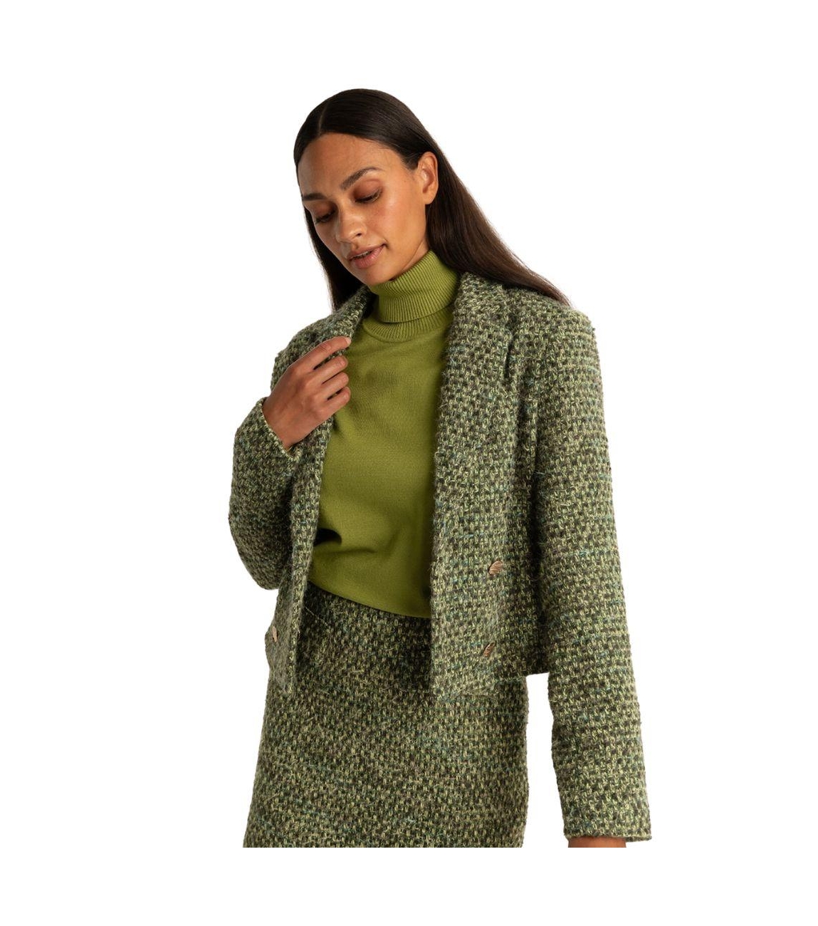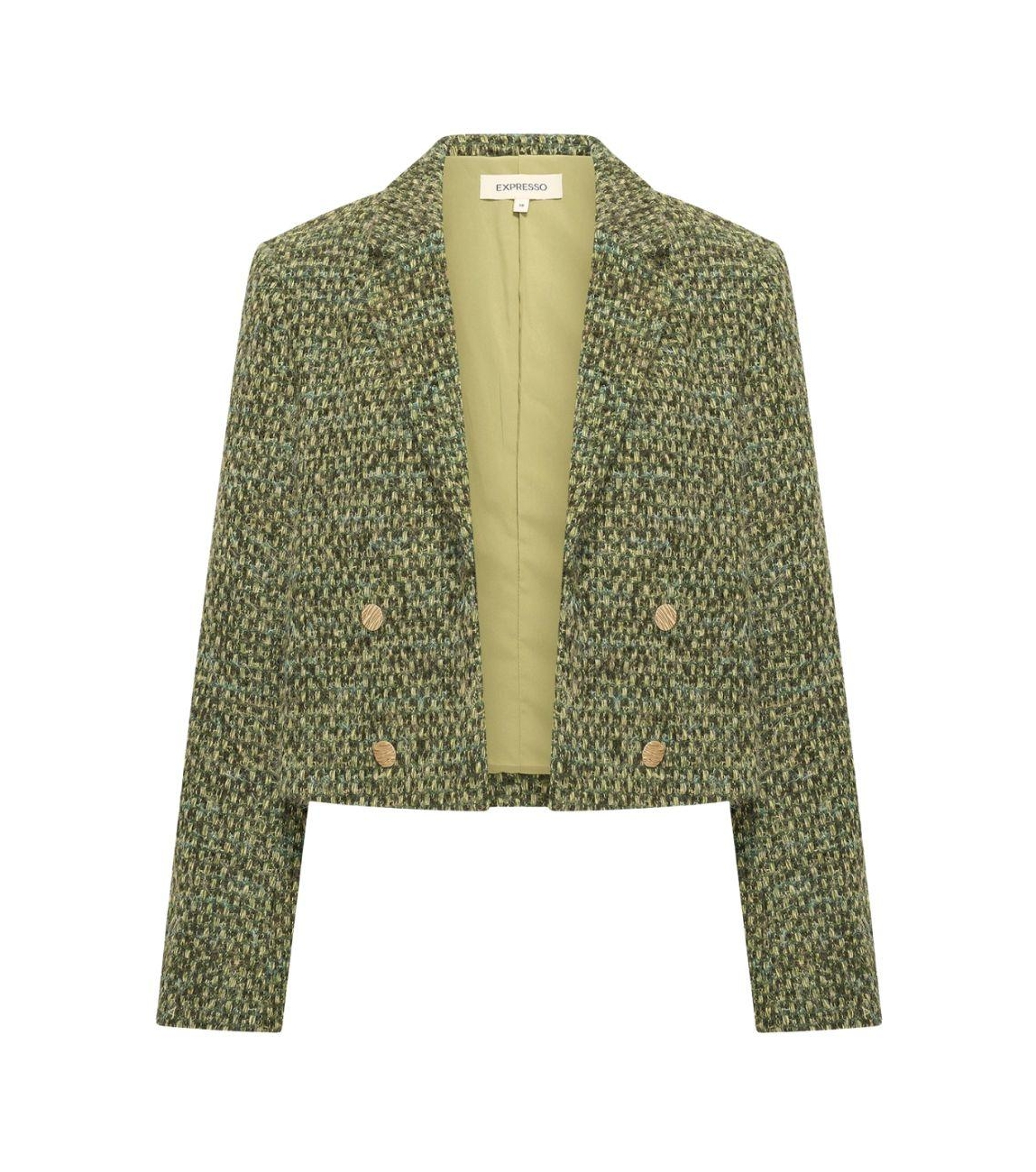 Expresso EX15-251146. Dit rechtvallende model heeft een reverskraag en lange mouwen. Deze groene bouclé blazer van Expresso sluit aan de voorzijde door middel van een dubbele rij goudkleuige knopen en is voorzien van schoudervulling.
