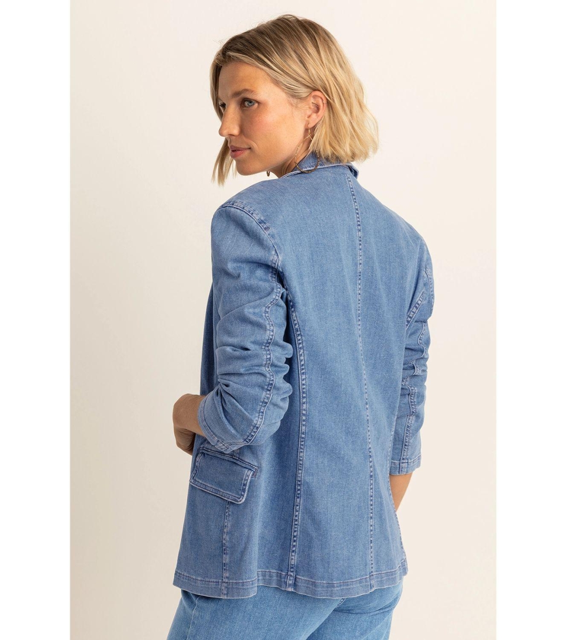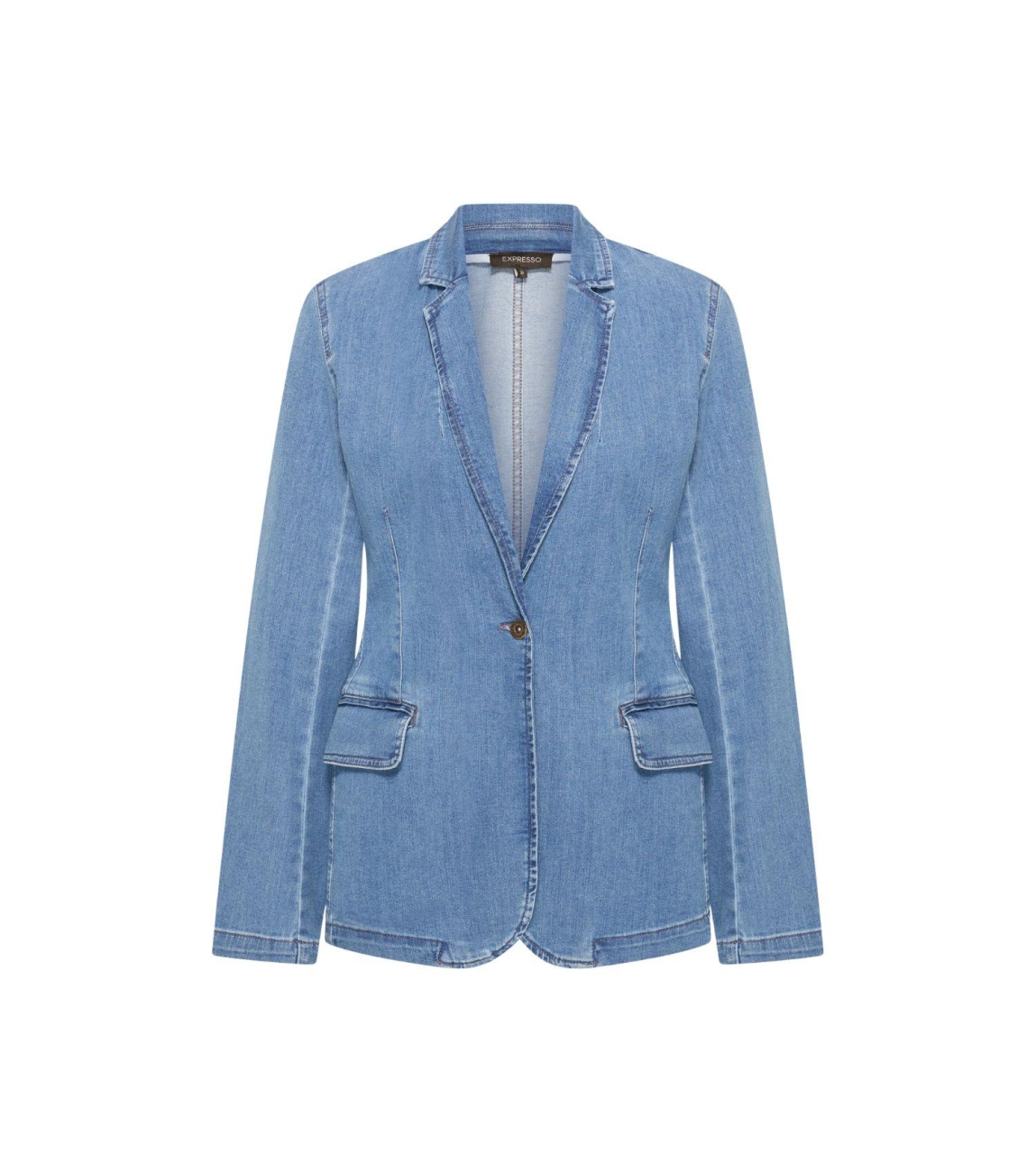 Expresso Blazer mid blue denim EX350 Mid blue denim. Dit licht aansluitende model is voorzien van een reverskraag en lange mouwen. Deze denim blazer van Expresso heeft twee klepzakken op de voorzijde. Dit model is uitgevoerd in een katoenmix met lichte stretch.