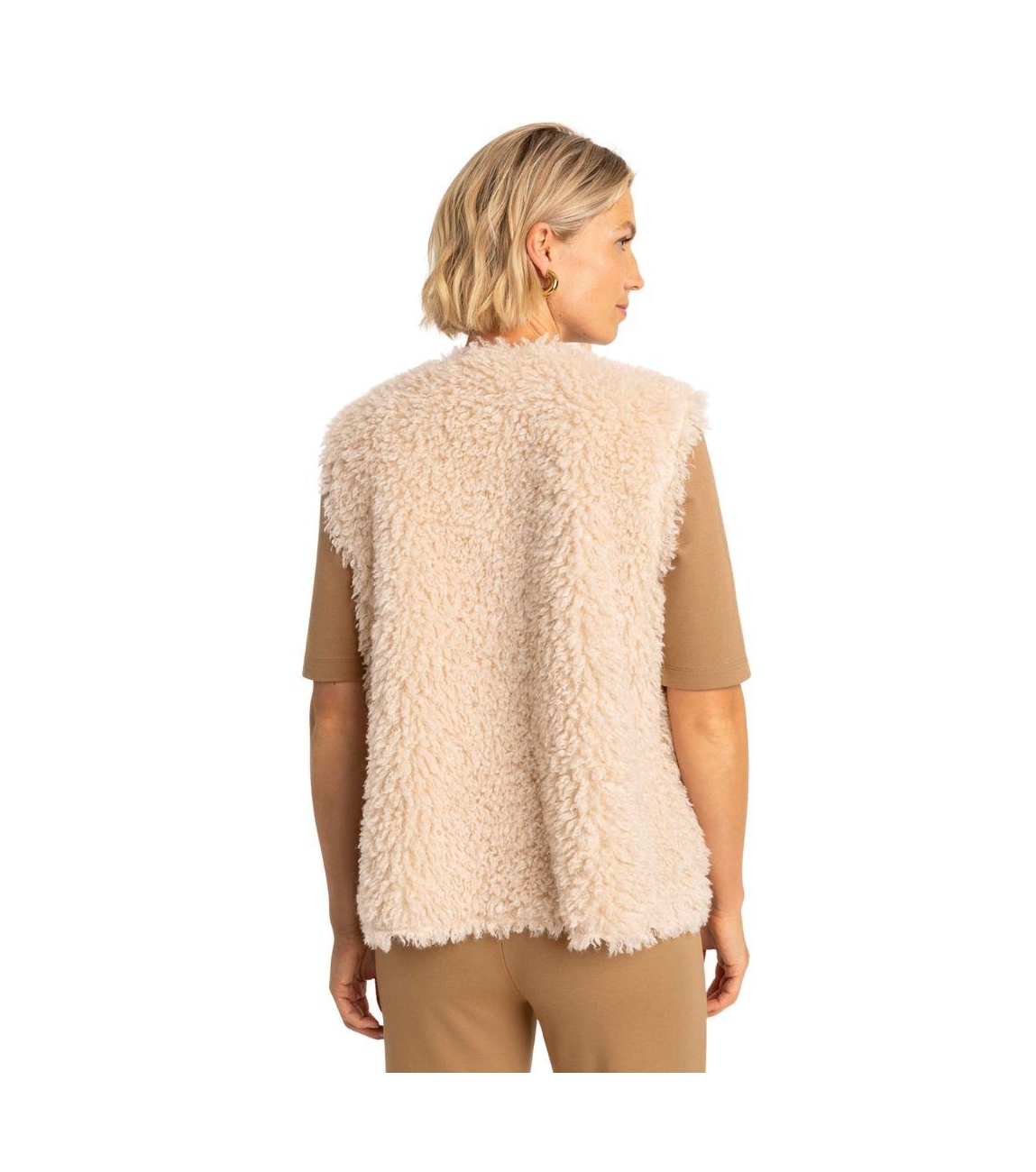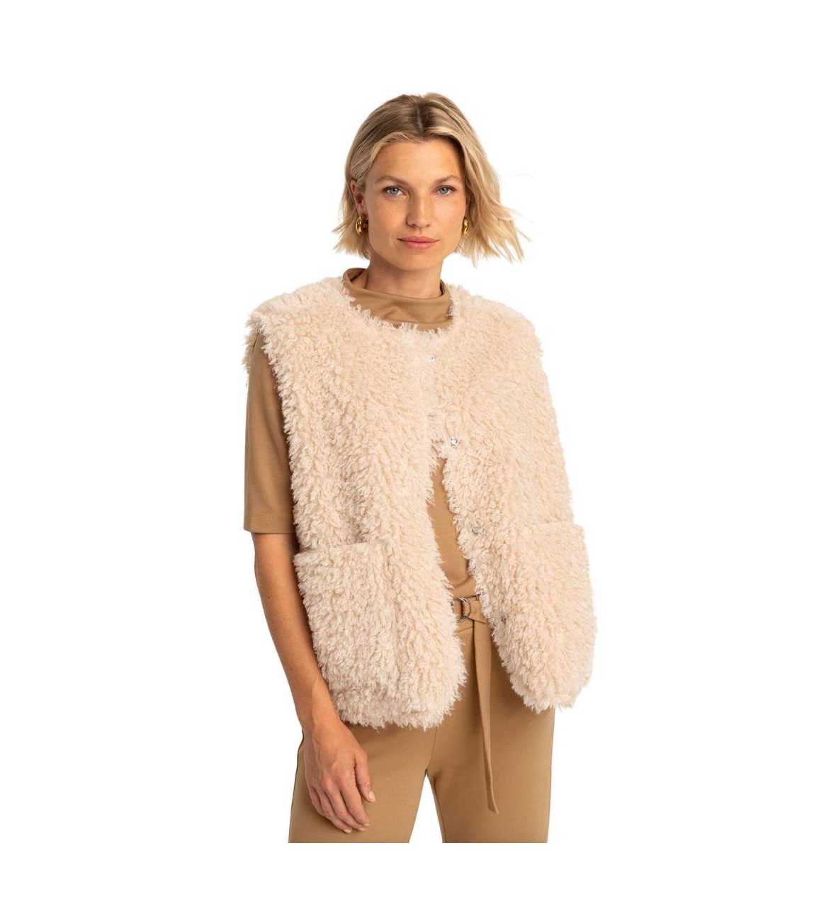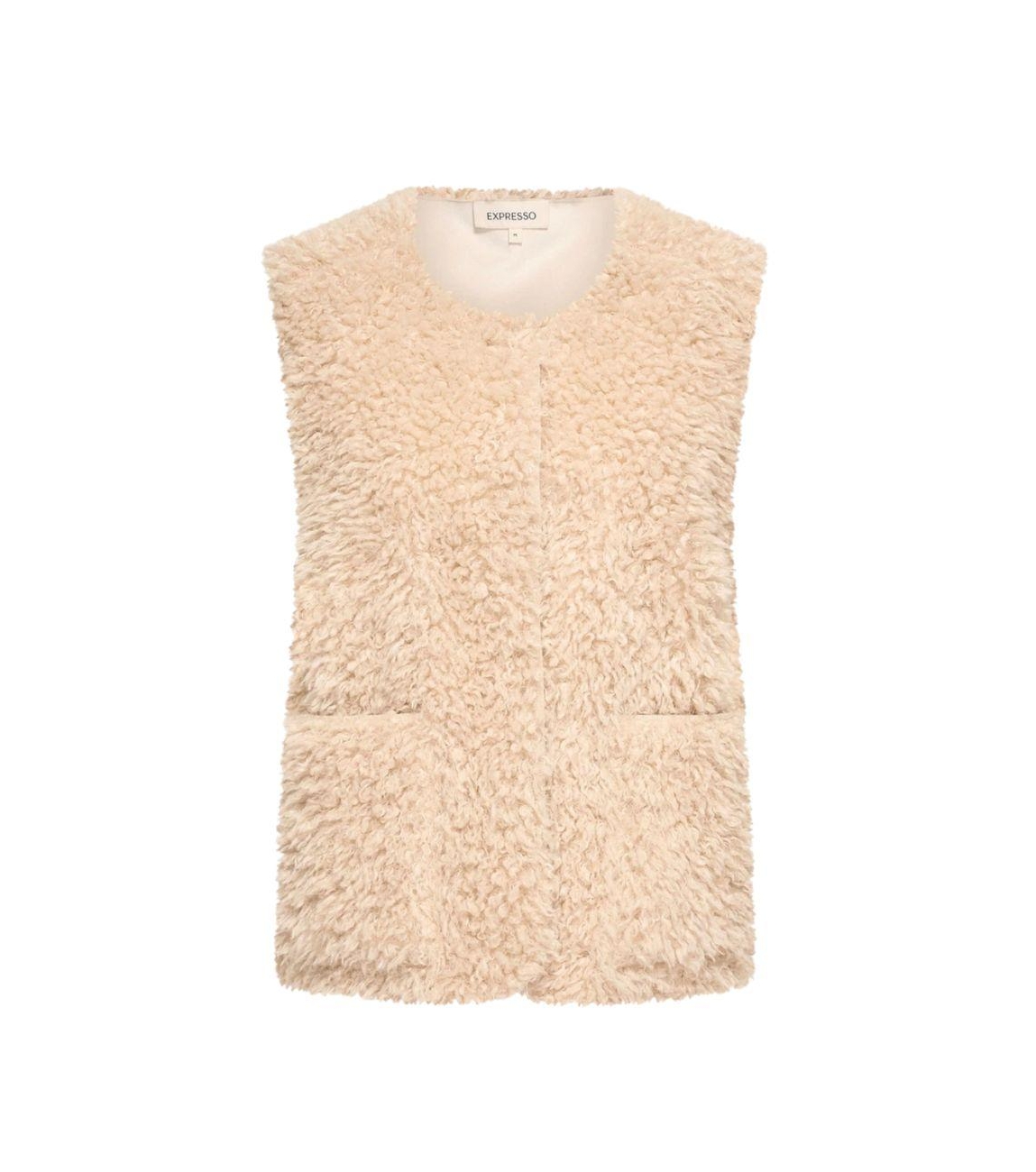 Expresso bodywarmer EX16-25827. Dit rechtvallend model is voorzien van een ronde hals en is mouwloos. Deze beige teddy gilet sluit door middel van knopen en beschikt over twee zakken.