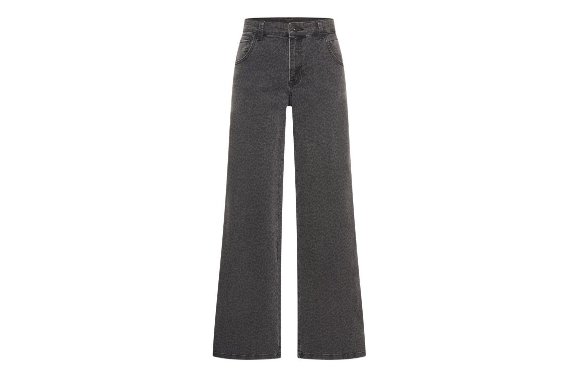 Expresso Pants denim wide leg print EX900 Black. Dit wide leg model sluit door middel van een knoop en ritsaansluiting en heeft ceintuurlussen. Deze zwarte jeans van Expresso is uitgevoerd in een subtiel luipaardprint.