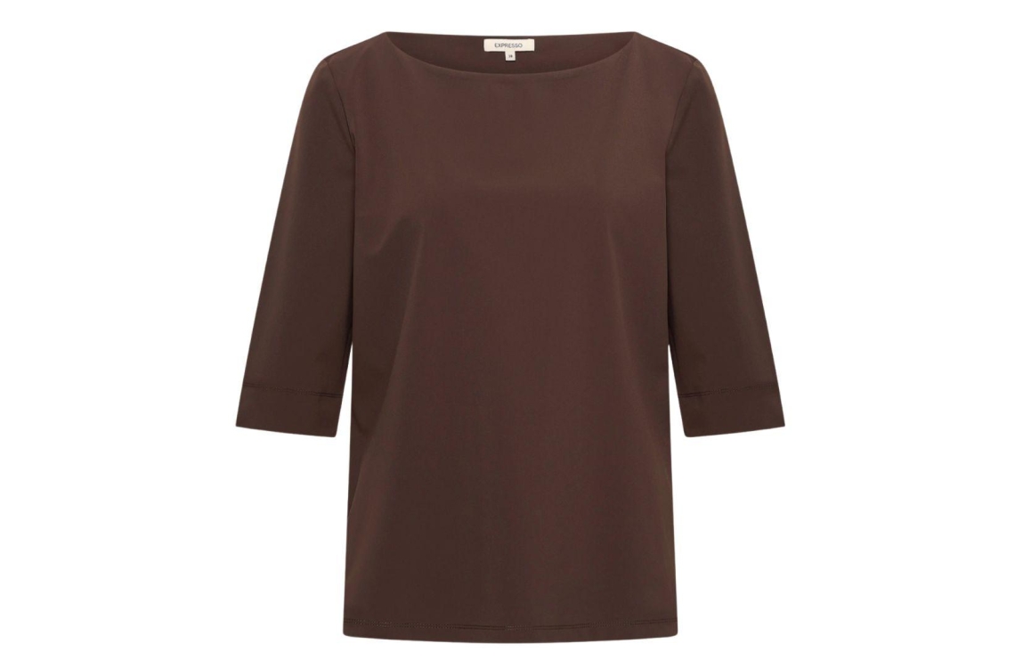 Expresso shirt EX13-25786 EX101. Dit rechtvallende model heeft een wijde halslijn en driekwart mouwen. Deze donkerbruine shirt van Expresso is uitgevoerd in stretchkwaliteit.