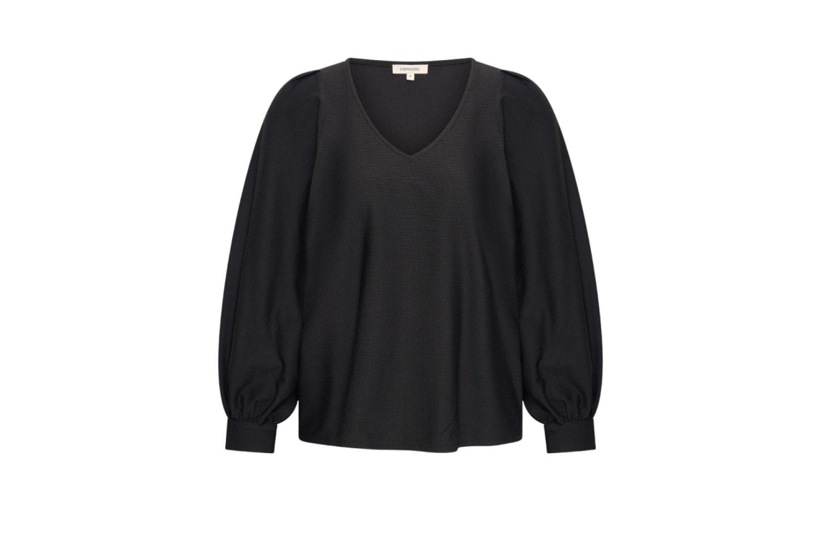 Expresso top EX13-25789. Dit rechtvallend model is voorzien van een v-hals en heeft wijde driekwart mouwen. Deze zwarte top van Expresso is gestructureerd uitgevoerd.