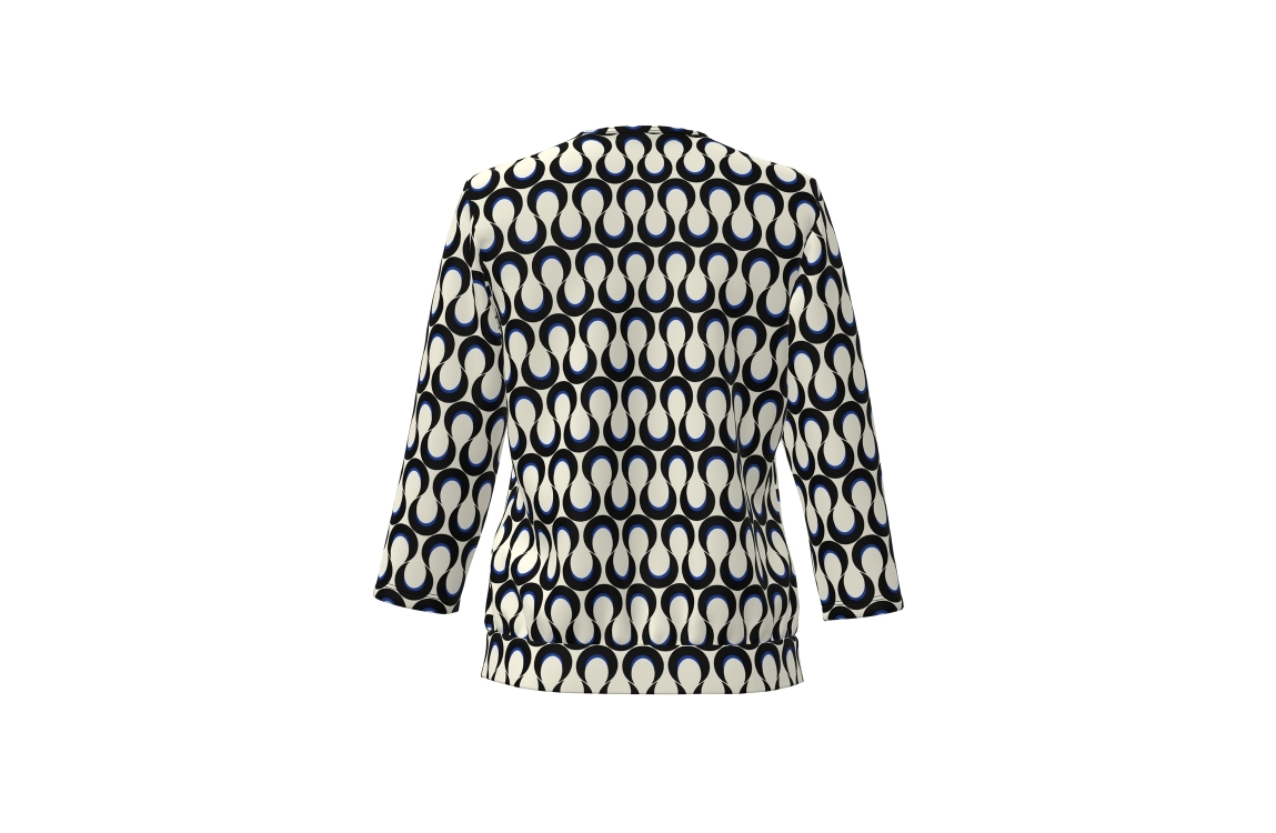 Frank Walder NOSBlusenshirts 552/055 Blue print. Dit rechtvallend model is voorzien van een ronde hals en heeft driekwart mouwen. Dit off-white model van Frank Walder is bewerkt met een blauwe en zwarte print en heeft bij de halslijn plooien. Dit model is voorzien van een elastische band aan de onderzijde.