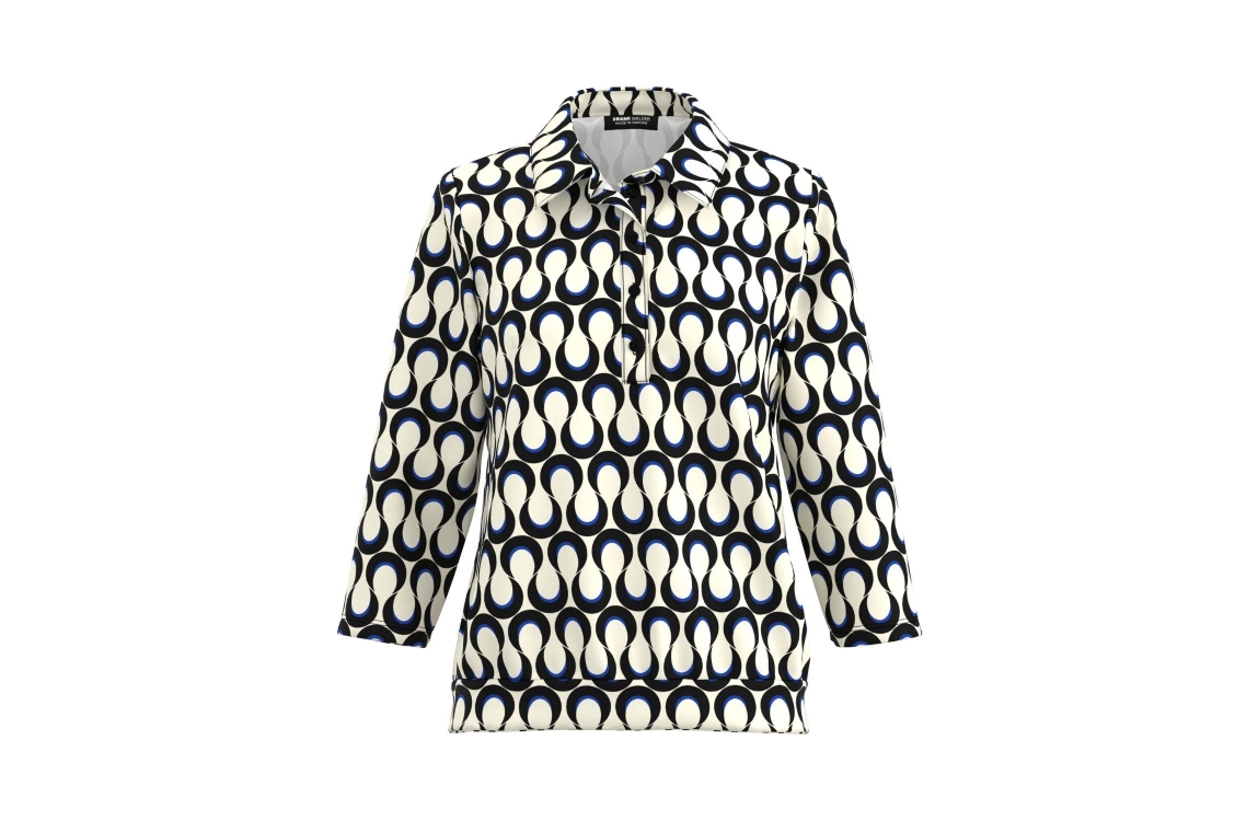 Frank Walder NOSTop/TShirt 552/055 Blue print. Dit rechtvallend model heeft een kraag en driekwart mouwen. Deze off-white top van Frank Walder is all-over bewerkt met een print en sluit aan de voorzijde door middel van knopen. Dit model is uitgevoerd in een stretch-kwaliteit.