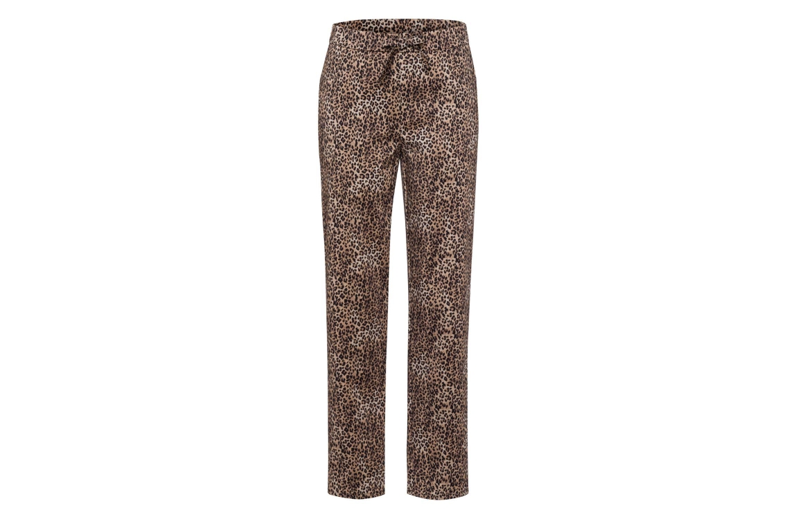 Frank Walder W52Hose 532/086 Beige/brown print. Dit regular fit model sluit door middel van een elastische boord en trektouw. Deze bruine broek van Frank Walder is voorzien van twee steekzakken aan de voorzijde. Dit model is all-over bewerkt met een panterprint.