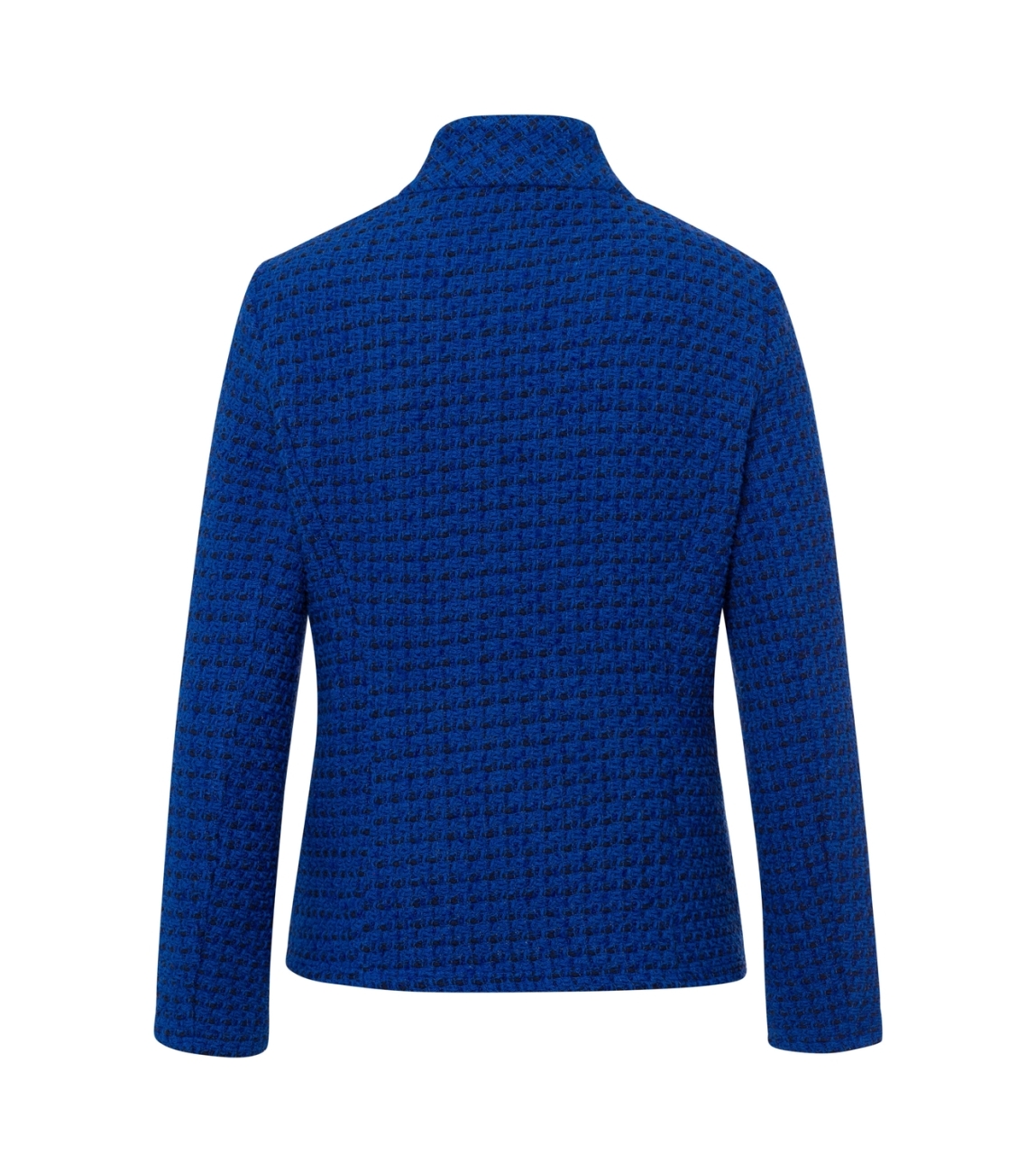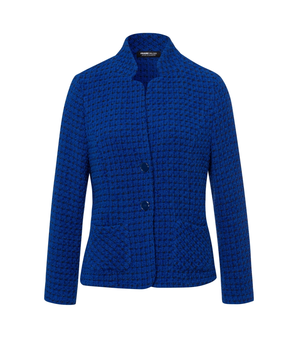 Frank Walder blazer W52209303 021/055. Dit licht getailleerde model heeft een opstaande kraag en lange mouwen. Deze donkerblauwe blazer van Frank Walder sluit aan de voorzijde door middel van knopen en is uitgevoerd in tweed-kwaliteit. Het model is voorzien van twee opgestikte zakken aan de voorzijde.