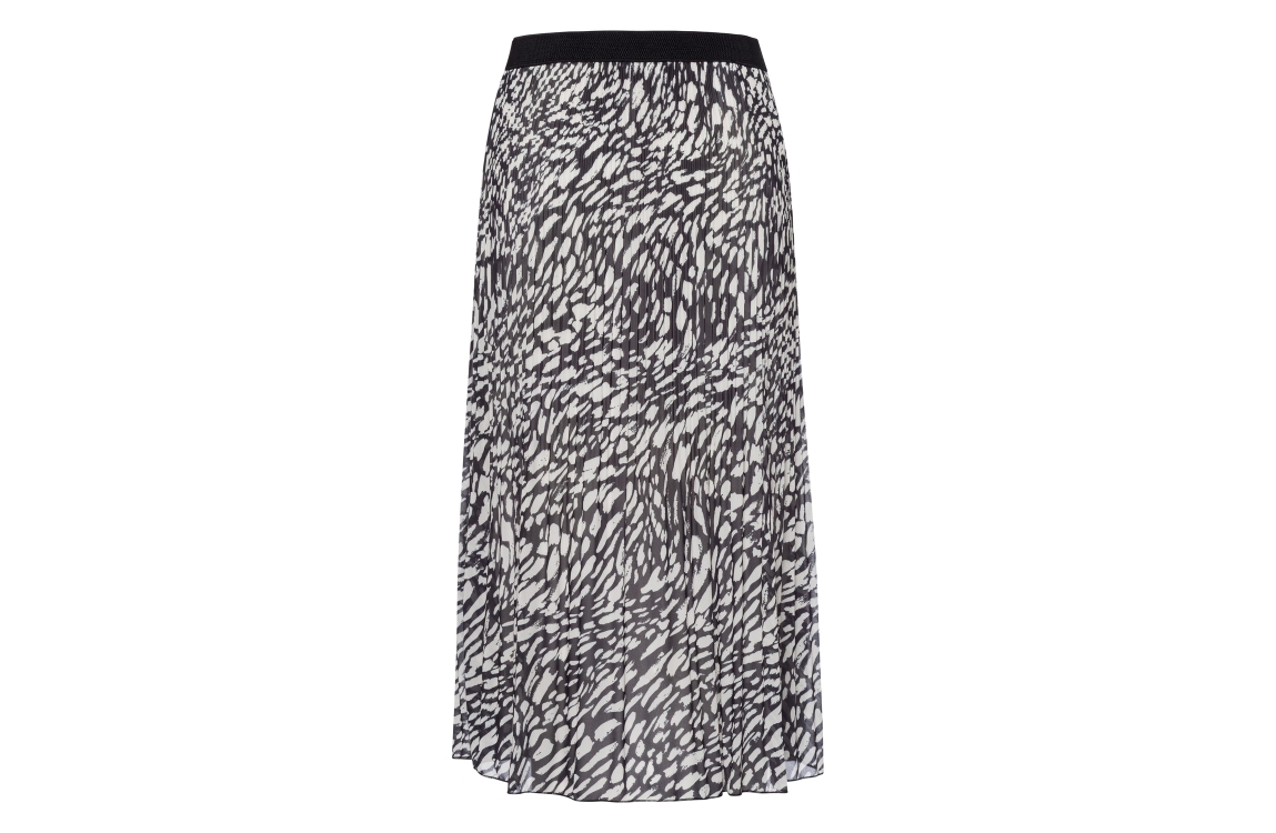 Frank Walder rok 209.250.  Dit rechtvallend model is voorzien van een elastische boord en beschikt over een voering. Deze zwarte/witte rok van Frank Walder is uitgevoerd in een plissé materiaal.