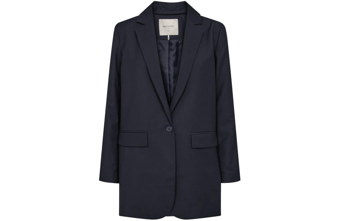Freequent 207029 Lio blazer. Dit sportieve model is voorzien van een kraag en heeft lange mouwen afgewerkt met een split en knoop. Deze donkerblauwe blazer van Freequent sluit aan de voorzijde door middel van knoop en voorzien van twee decoratieve klepzakken. Dit model is aan beide zijden bewerkt met wit gestreepte bies.