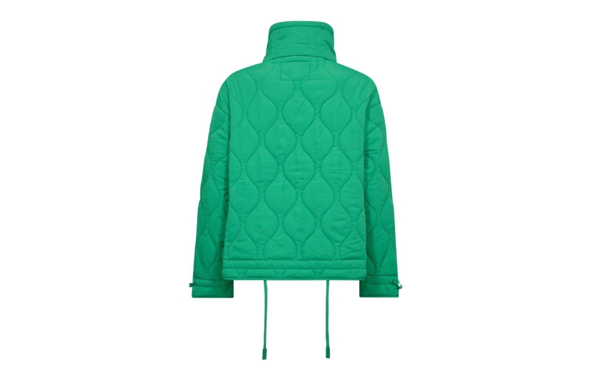Freequent jacket FQBLOB 203625. Dit rechtvallend model is voorzien van een hoge kraag en heeft lange mouwen. Deze felgroene jacket van Freequent sluit door middel van een rits en knopen, beschikt over twee zakken en trekkoorden bij de kraag en aan de onderzijde. Dit model is bewerkt met een patroon en is gewatteerd uitgevoerd.