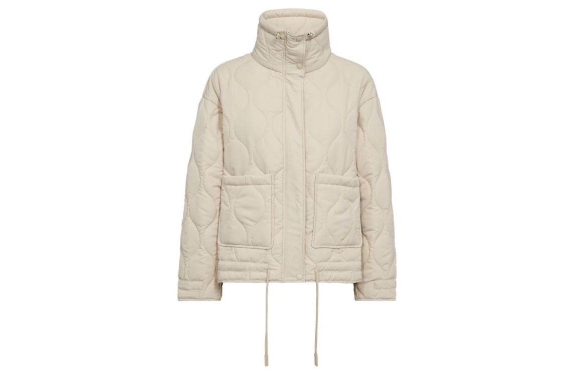 Freequent jacket FQBLOB 203625. Dit rechtvallend model is voorzien van een hoge kraag en heeft lange mouwen. Deze beige jacket van Freequent sluit door middel van een rits en knopen, beschikt over twee zakken en trekkoorden bij de kraag en aan de onderzijde. Dit model is bewerkt met een patroon en is gewatteerd uitgevoerd.