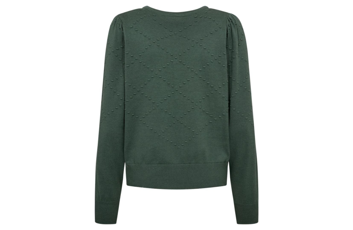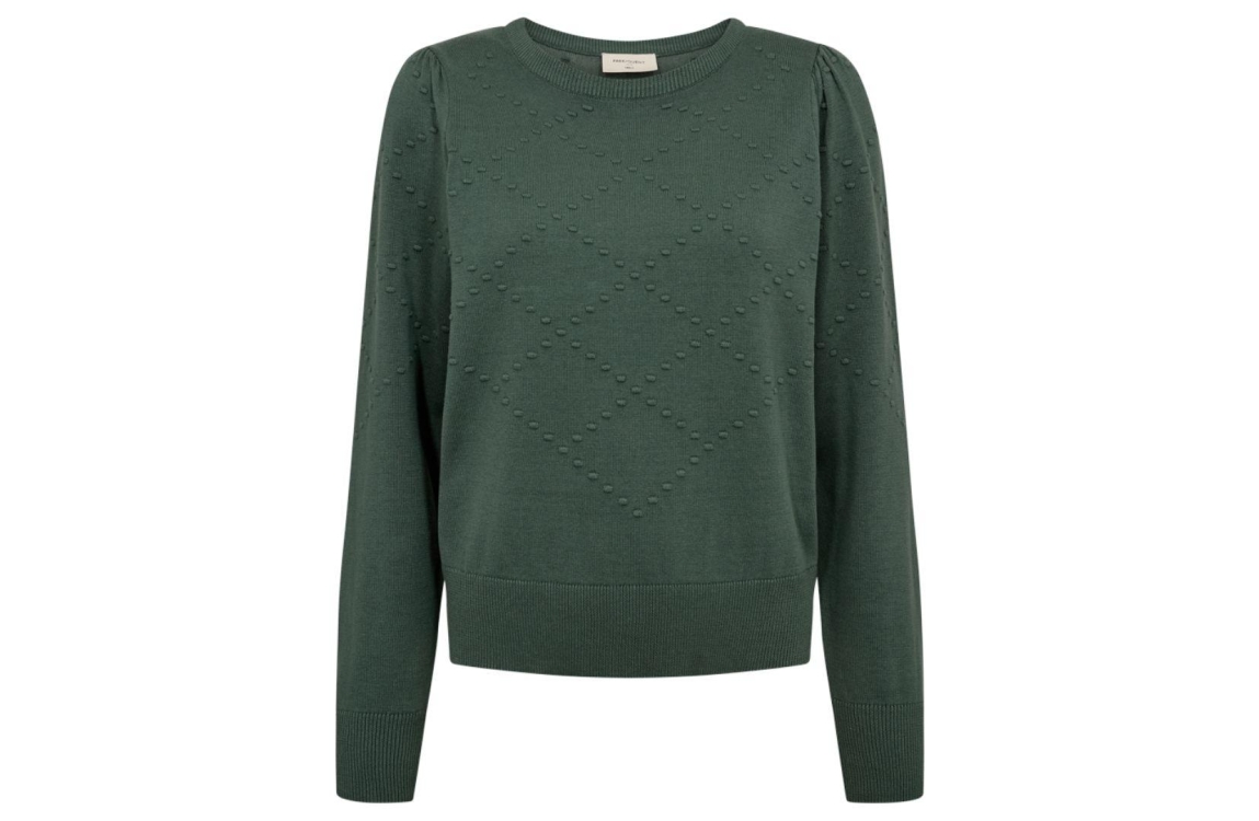 Freequent pullover 205431. Dit rechtvallende model heeft een ronde halslijn en lange mouwen. Deze donkergroene pullover van Freequent is all-over bewerkt met een structuurbreisel en heeft ribgebreide boorden.