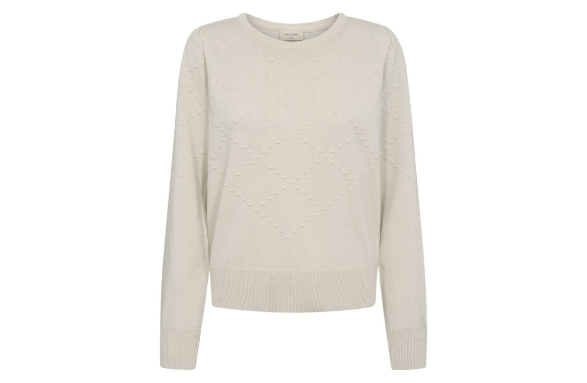 Freequent pullover 205431. Dit rechtvallende model heeft een ronde halslijn en lange mouwen. Deze beige pullover van Freequent is all-over bewerkt met een structuurbreisel en heeft ribgebreide boorden.