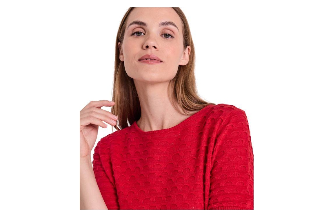 Freequent pullover 205789. Dit rechtvallende model heeft een ronde halslijn en korte mouwen. Deze rode top van Freequent is uitgevoerd met een structuur en is afgewerkt met ribgebreide boorden.