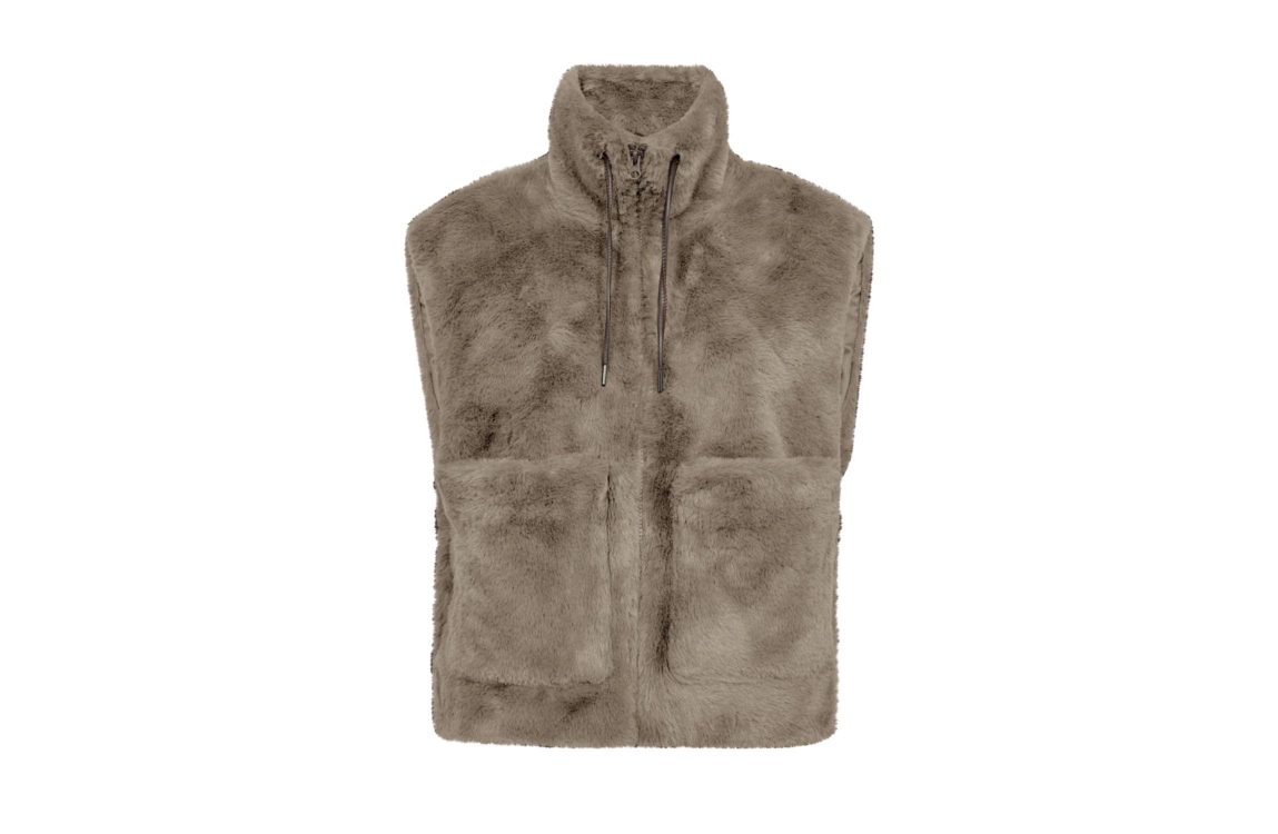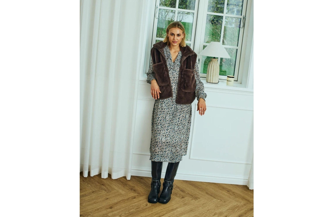 Freequent FQFONY-WAISTCOAT 8348 Morel. Dit rechtvallende model is voorzien van een opstaande kraag met trekkoord en is mouwloos. Deze bruine gilet van Freequent sluit door middel van een rits en heeft twee steekzakken aan de voorzijde. Dit model is uitgevoerd in een faux fur kwaliteit.