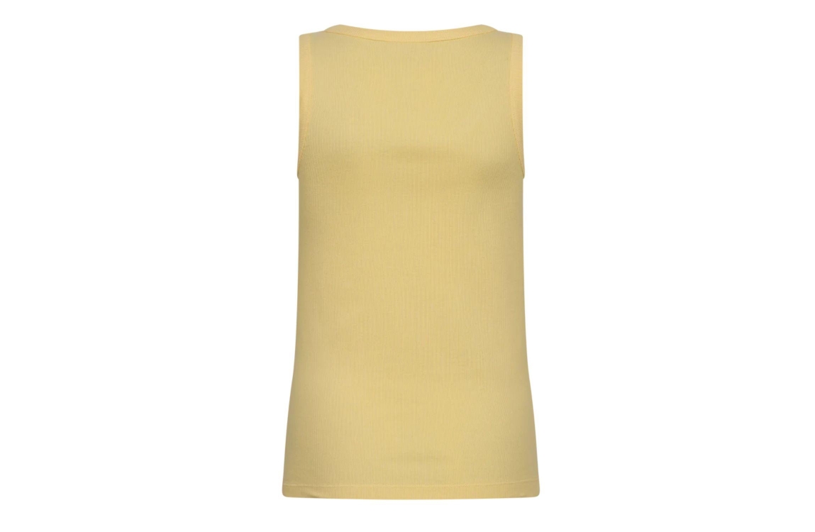 Freequent FQHI-TOP Golden Haze. Dit aangesloten model is voorzien van een ronde hals en is mouwloos. Deze gele top van Freequent heeft brede schouderbanden en is gemaakt van een geribbeld materiaal.