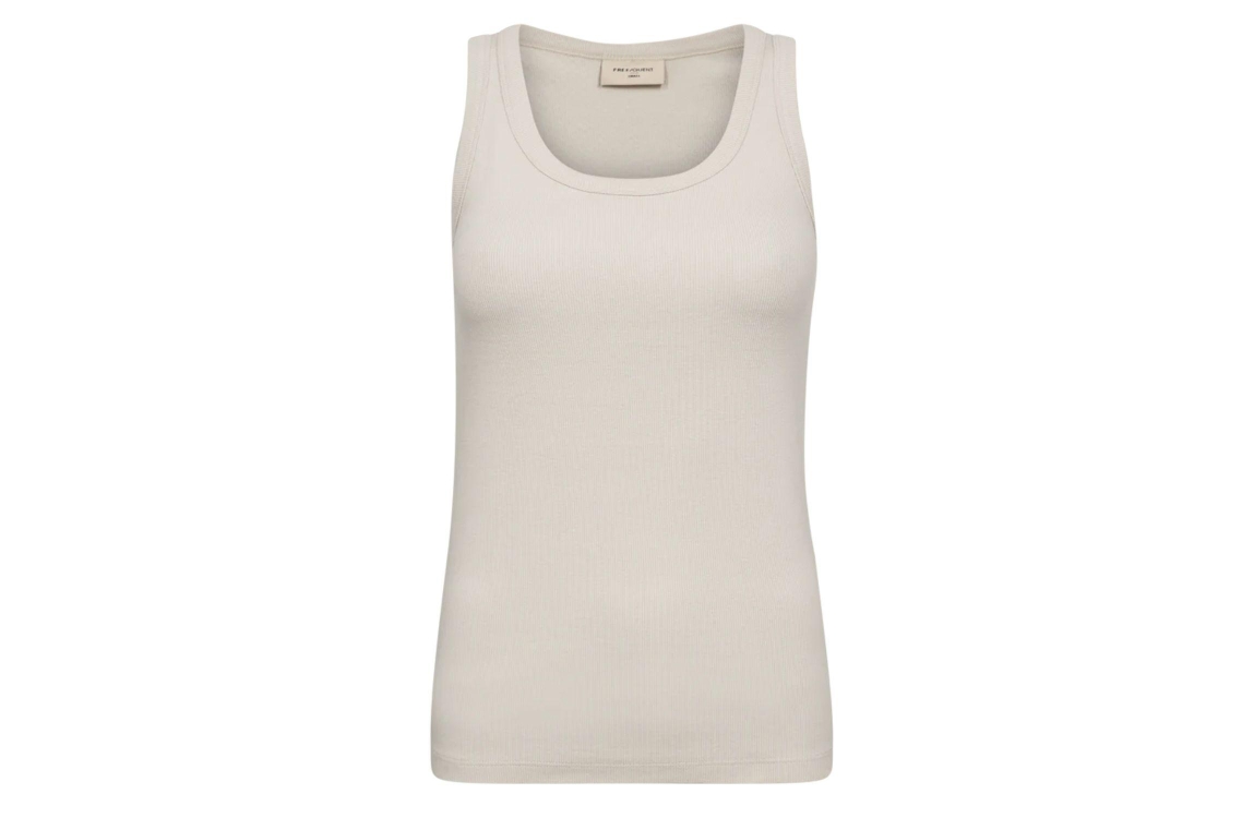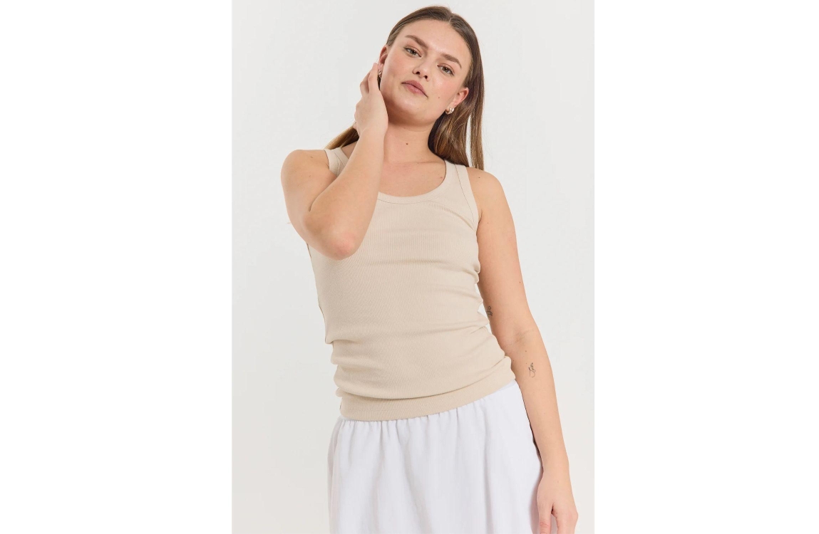 Freequent FQHI-TOP Moonbeam. Dit aangesloten model is voorzien van een ronde hals en is mouwloos. Deze bruine top van Freequent heeft brede schouderbanden en is gemaakt van een geribbeld materiaal.