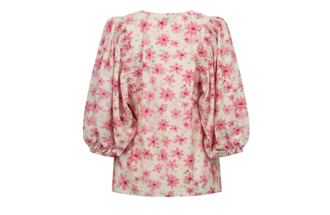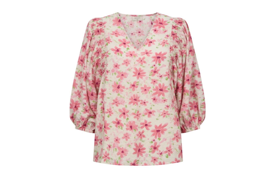 Freequent FQJovi blouse 208165. Dit rechtvallend model is voorzien van een v-hals en heeft ballonvormige driekwart mouwen. Deze roze/paarse blouse van Freequent is bewerkt met een bloemenprint.