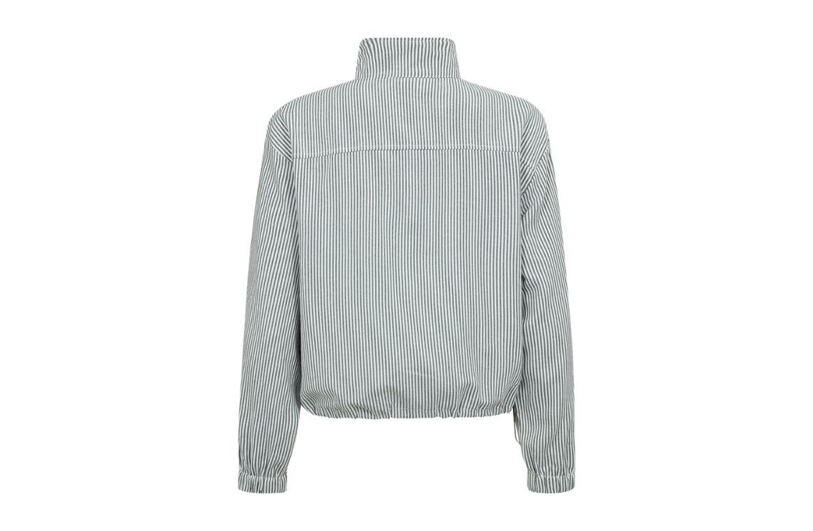 Freequent jasje 207840. Dit bombermodel heeft een opstaande kraag en lange mouwen met elastische boorden. Het donkergroene jasje van Freequent sluit aan de voorzijde door middel van een ritssluiting en is all-over bewerkt met een streepprint. Het model is voorzien van twee steekzakken en is afgewerkt met een elastische zoom met trekkoord.