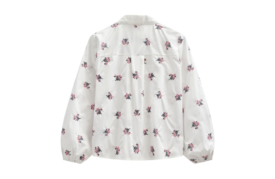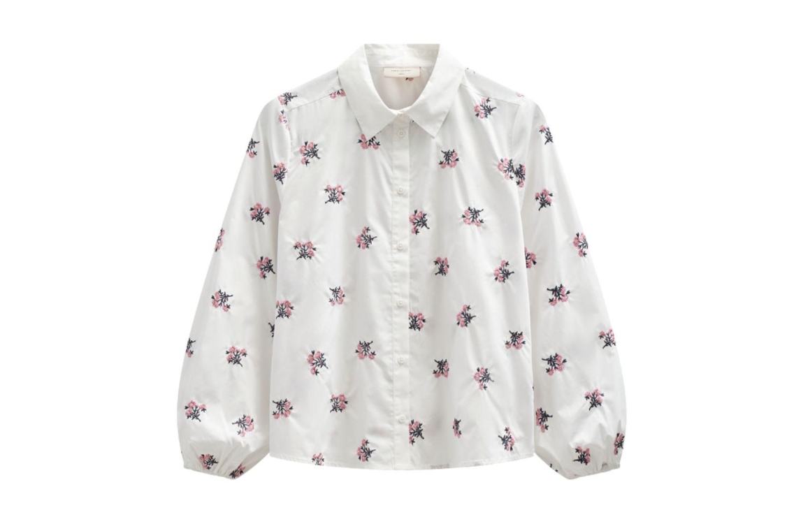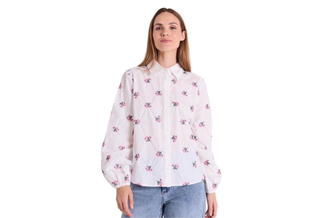 Freequent blouse 207433. Dit rechtvallende model heeft een kraag en lange mouwen. Deze witte blouse van Freequent sluit aan de voorzijde door middel van knopen en is all-over bewerkt met rozekleurige, geborduurde bloemen.