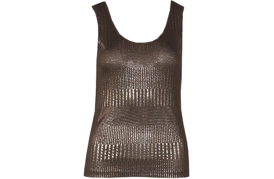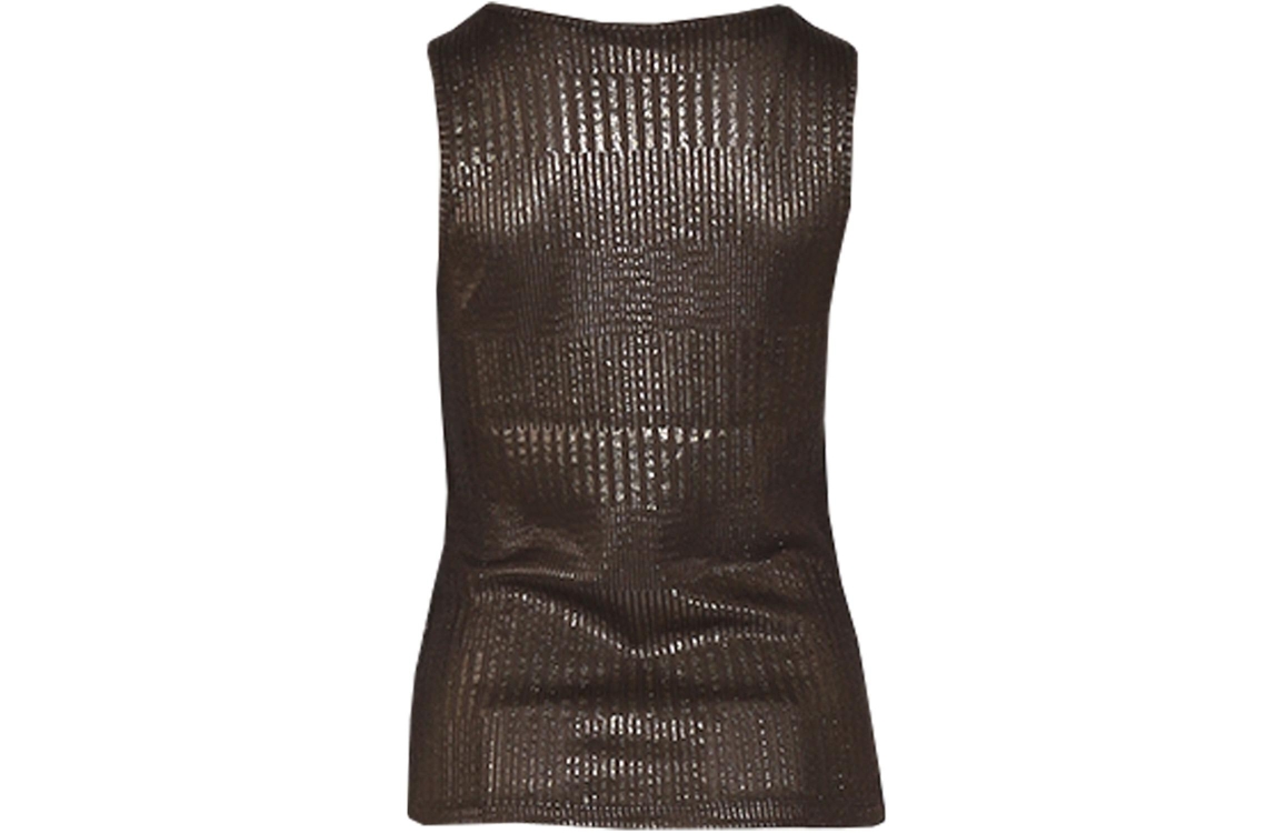 Freequent top FQMATTER 206042. Dit rechtvallend model is voorzien van een ronde hals en is mouwloos. Deze groene top van Freequent is bewerkt met metallic all-over.